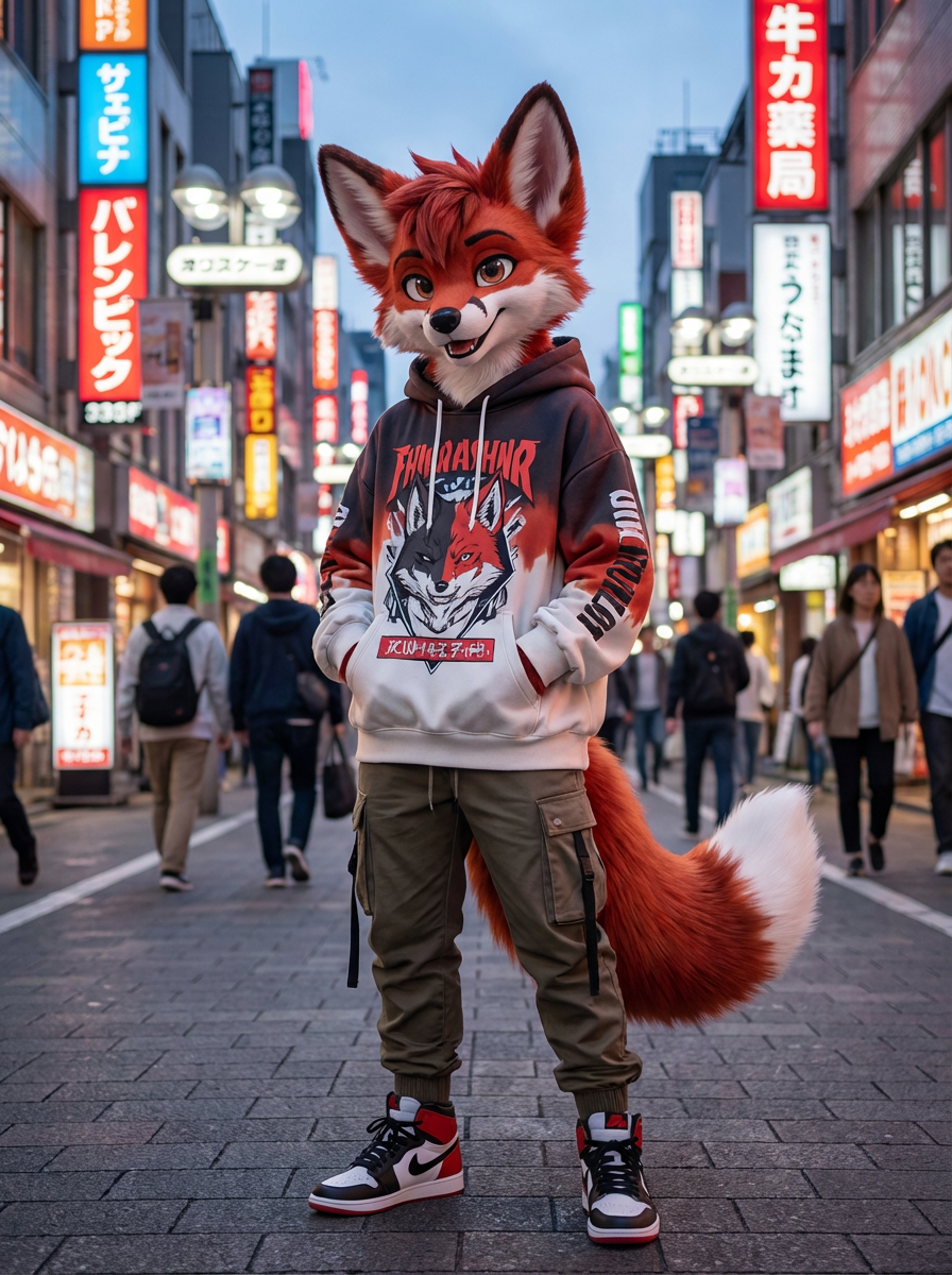 furry character of fox fursona of model with graceful vixen features, fluffy red and white fur, and cute fox ears , wearing trendy streetwear, playful expression, detailed digital furry art style
