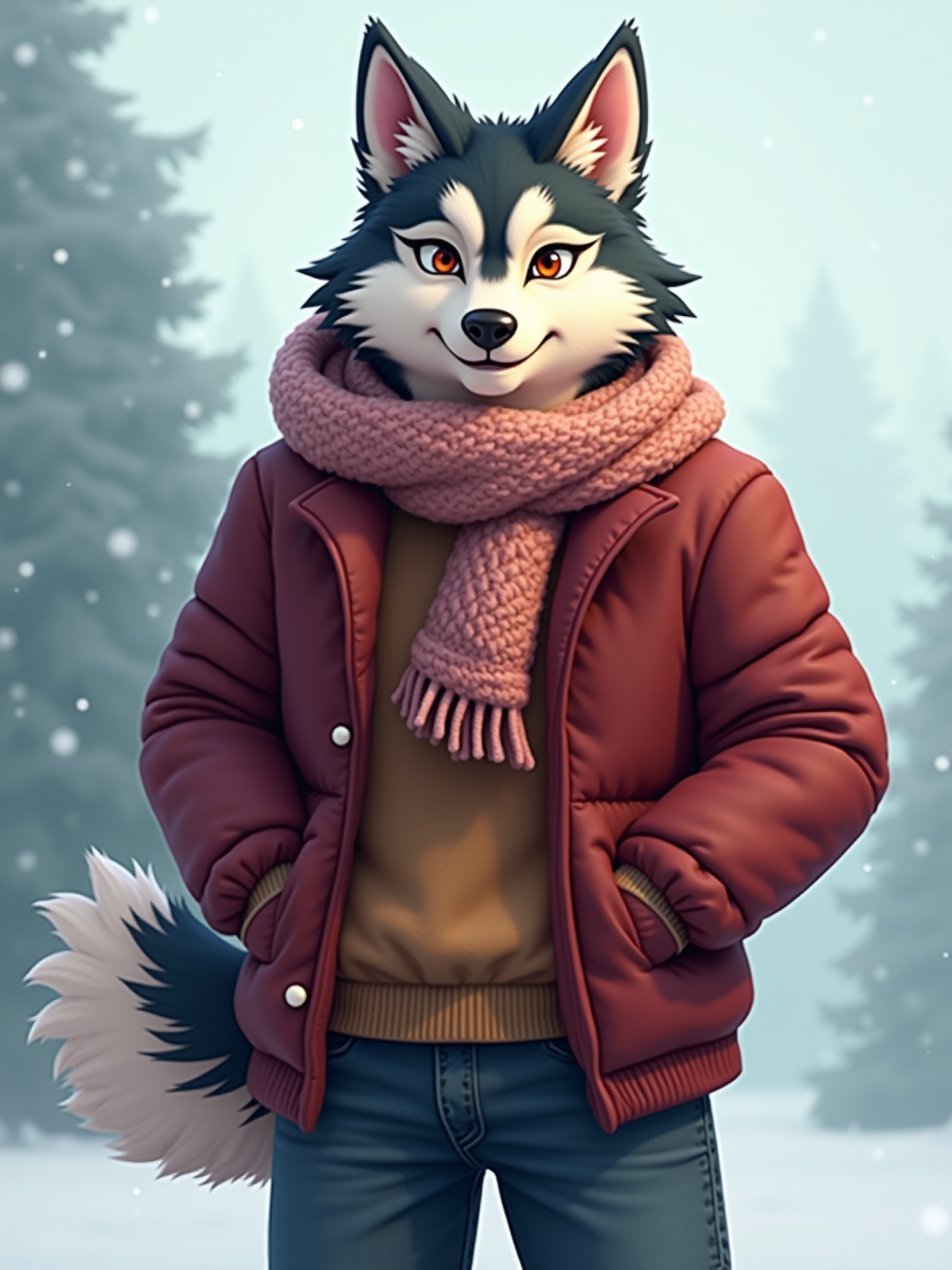 furry character of husky fursona of model with strong husky features, thick fur markings, and alert ears, wearing cozy winter clothing, cheerful expression, detailed digital furry art style, cool colors