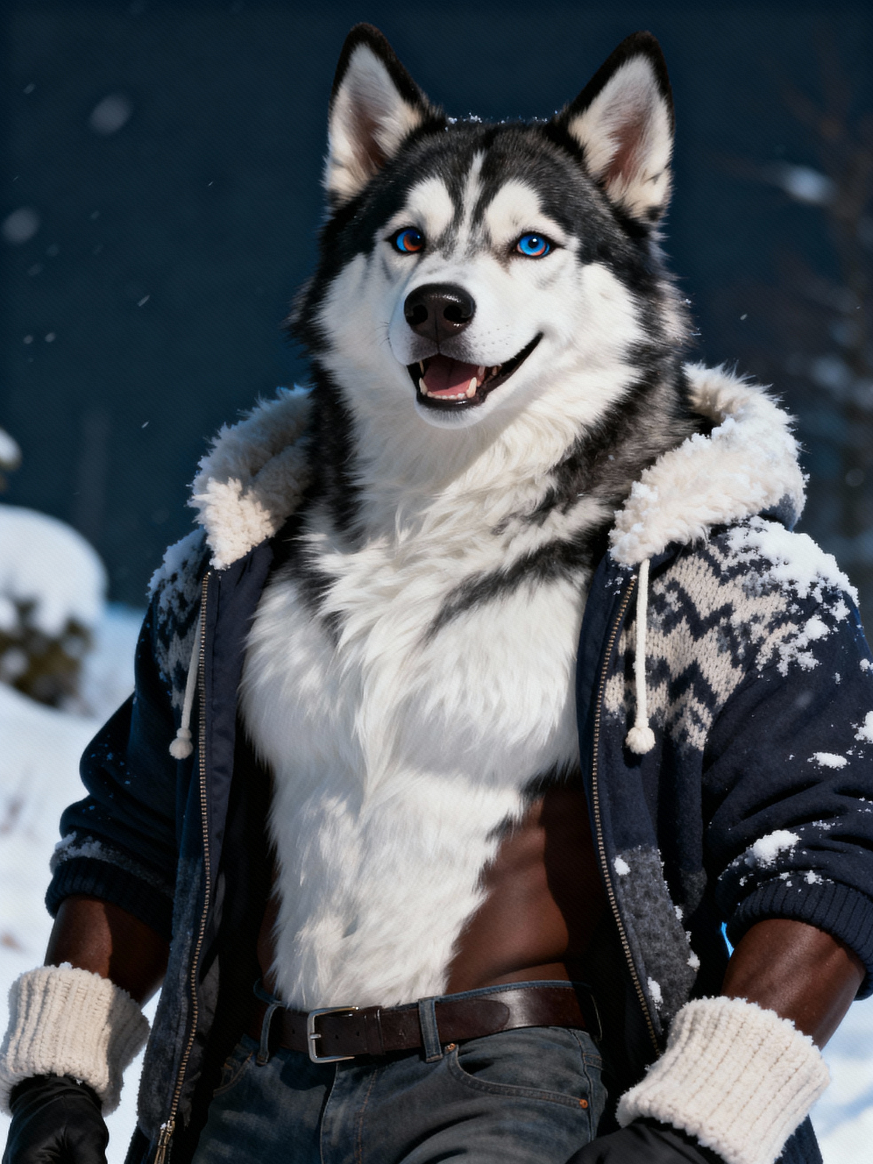 furry character of husky fursona of model with strong husky features, thick fur markings, and alert ears, wearing cozy winter clothing, cheerful expression, detailed digital furry art style, cool colors