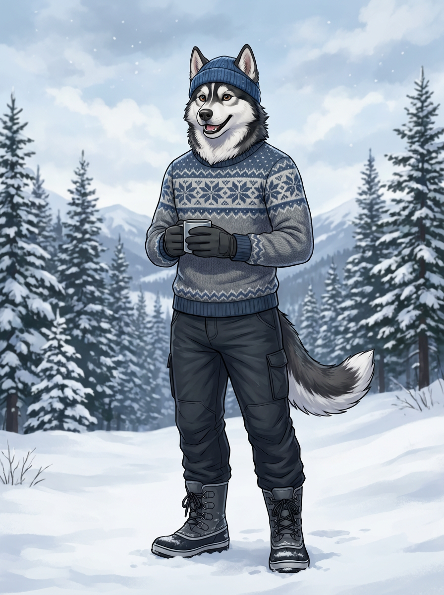 furry character of husky fursona of model with strong husky features, thick fur markings, and alert ears, wearing cozy winter clothing, cheerful expression, detailed digital furry art style, cool colors
