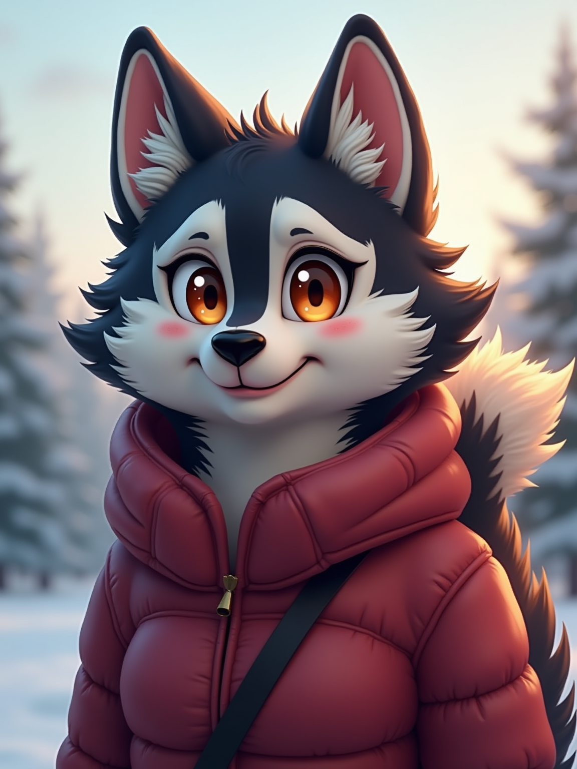 furry character of husky fursona of model with beautiful husky features, fluffy fur markings, and perky ears , wearing cozy winter clothing, cheerful expression, detailed digital furry art style, cool colors