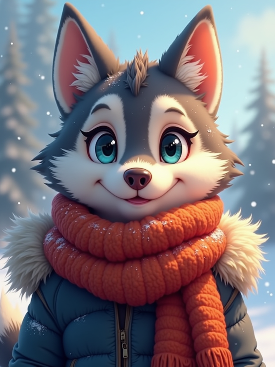 furry character of husky fursona of model with beautiful husky features, fluffy fur markings, and perky ears , wearing cozy winter clothing, cheerful expression, detailed digital furry art style, cool colors