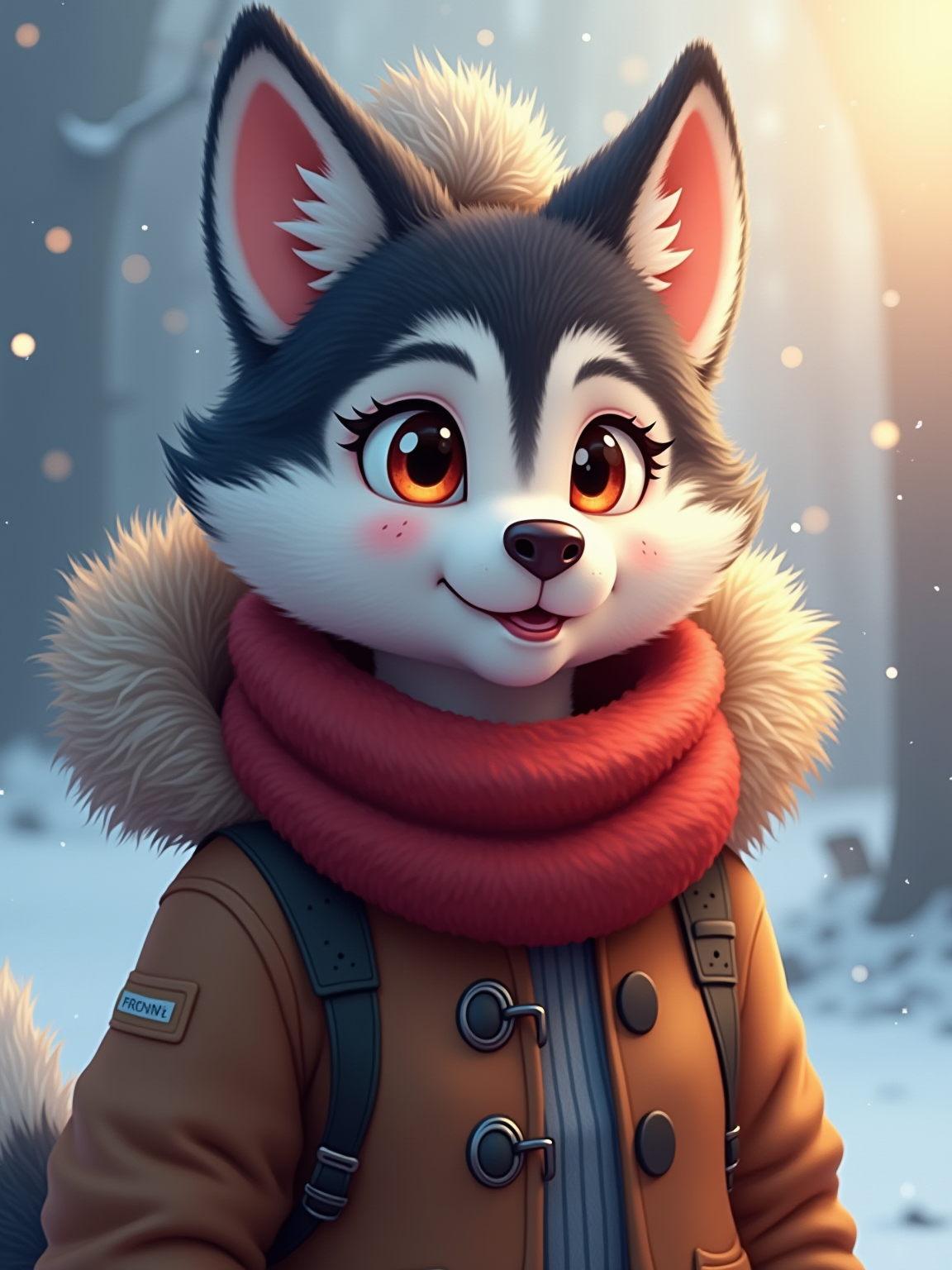 furry character of husky fursona of model with beautiful husky features, fluffy fur markings, and perky ears , wearing cozy winter clothing, cheerful expression, detailed digital furry art style, cool colors