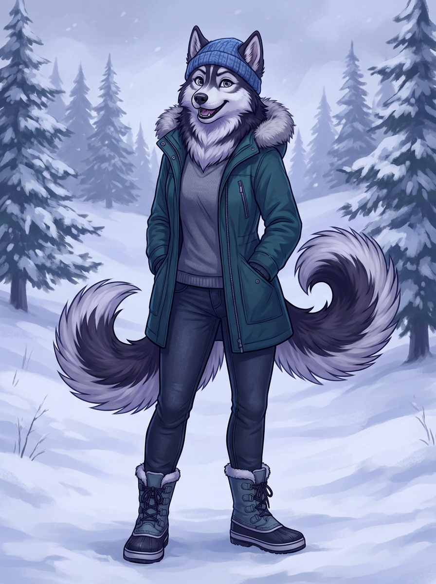furry character of husky fursona of model with beautiful husky features, fluffy fur markings, and perky ears , wearing cozy winter clothing, cheerful expression, detailed digital furry art style, cool colors