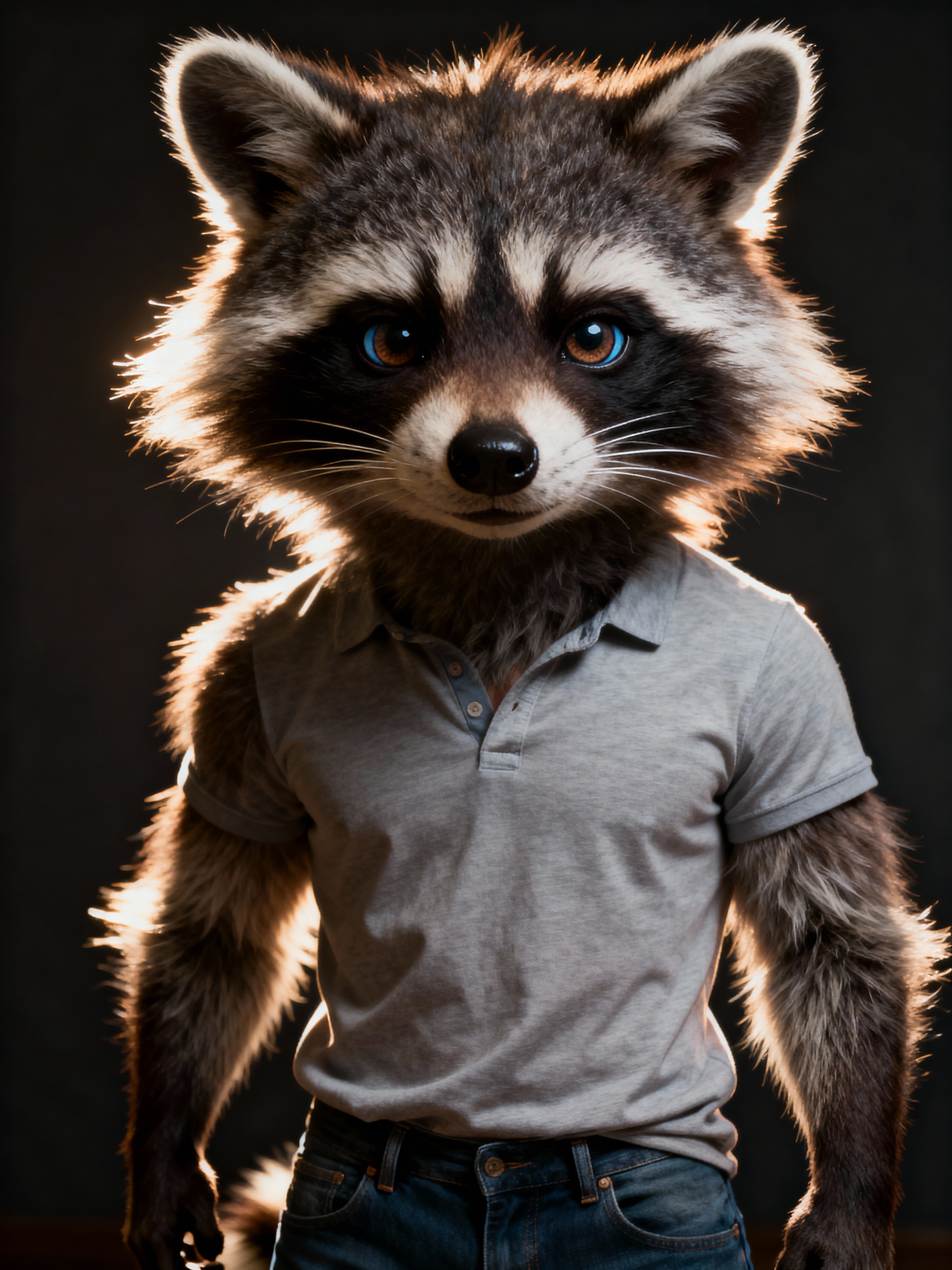 furry character of raccoon fursona of model with cute raccoon features, fluffy fur, and cute raccoon ears, wearing cute casual wear, cute expression, detailed digital furry art style