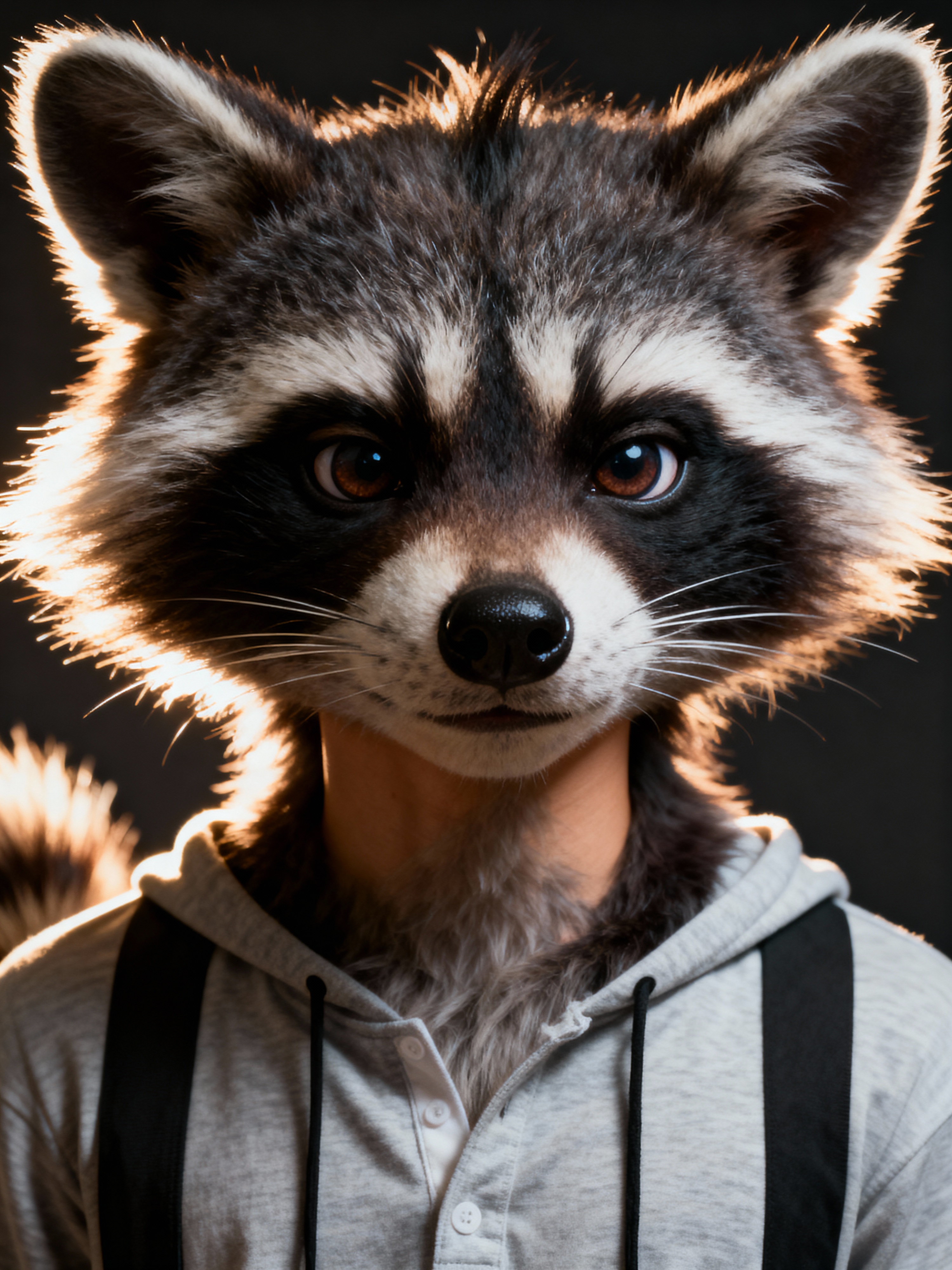 furry character of raccoon fursona of model with cute raccoon features, fluffy fur, and cute raccoon ears, wearing cute casual wear, cute expression, detailed digital furry art style