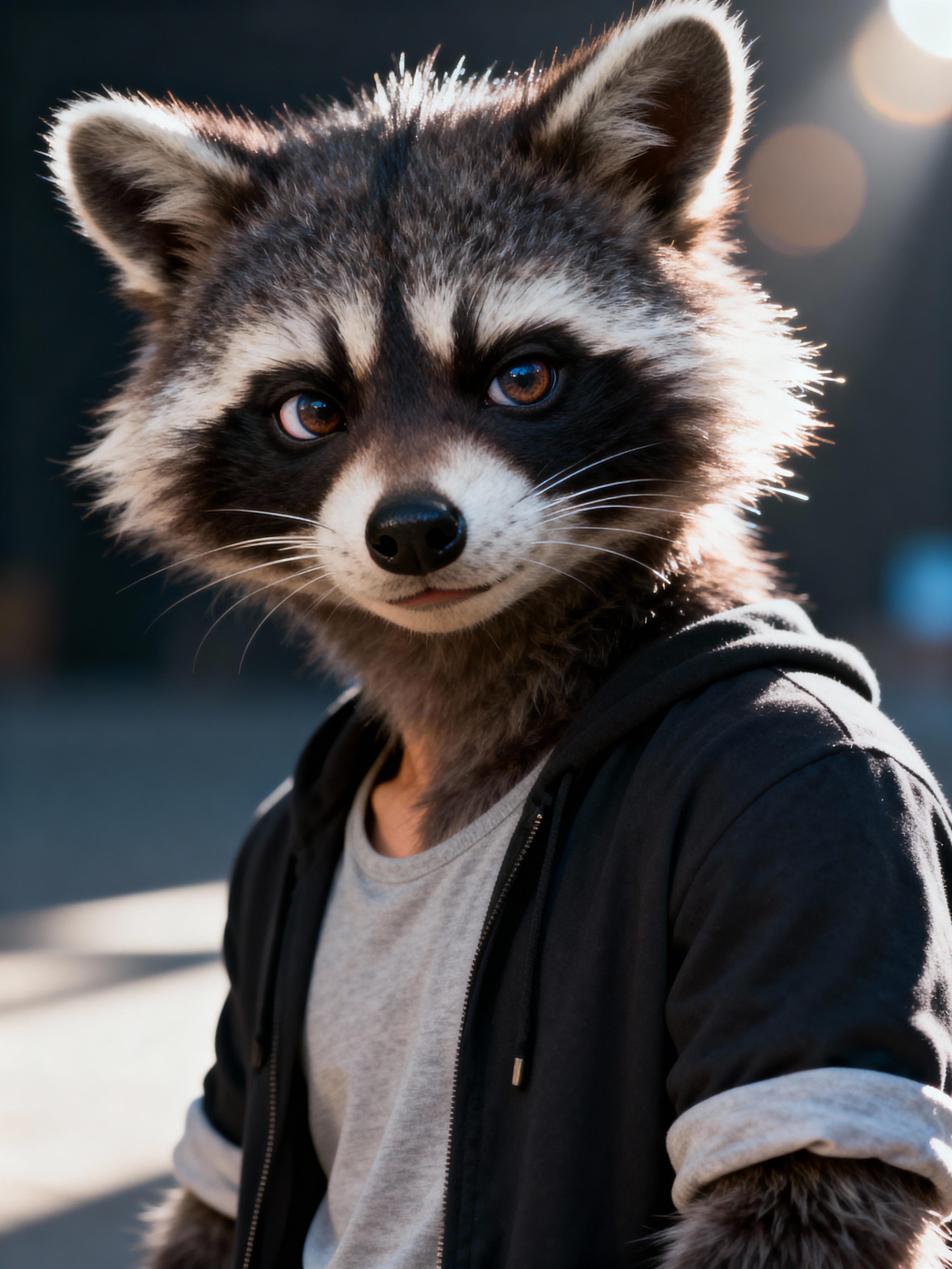 furry character of raccoon fursona of model with cute raccoon features, fluffy fur, and cute raccoon ears, wearing cute casual wear, cute expression, detailed digital furry art style