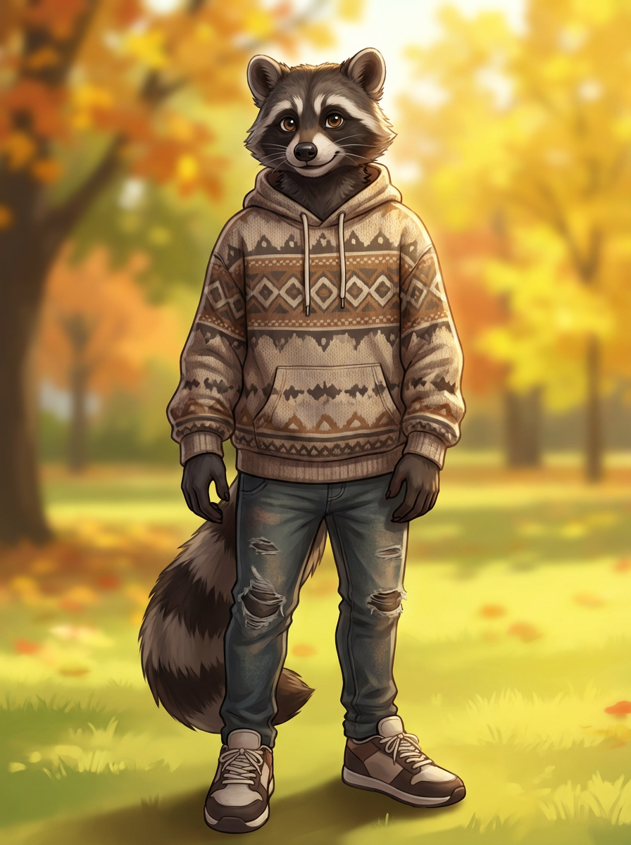 furry character of raccoon fursona of model with cute raccoon features, fluffy fur, and cute raccoon ears, wearing cute casual wear, cute expression, detailed digital furry art style