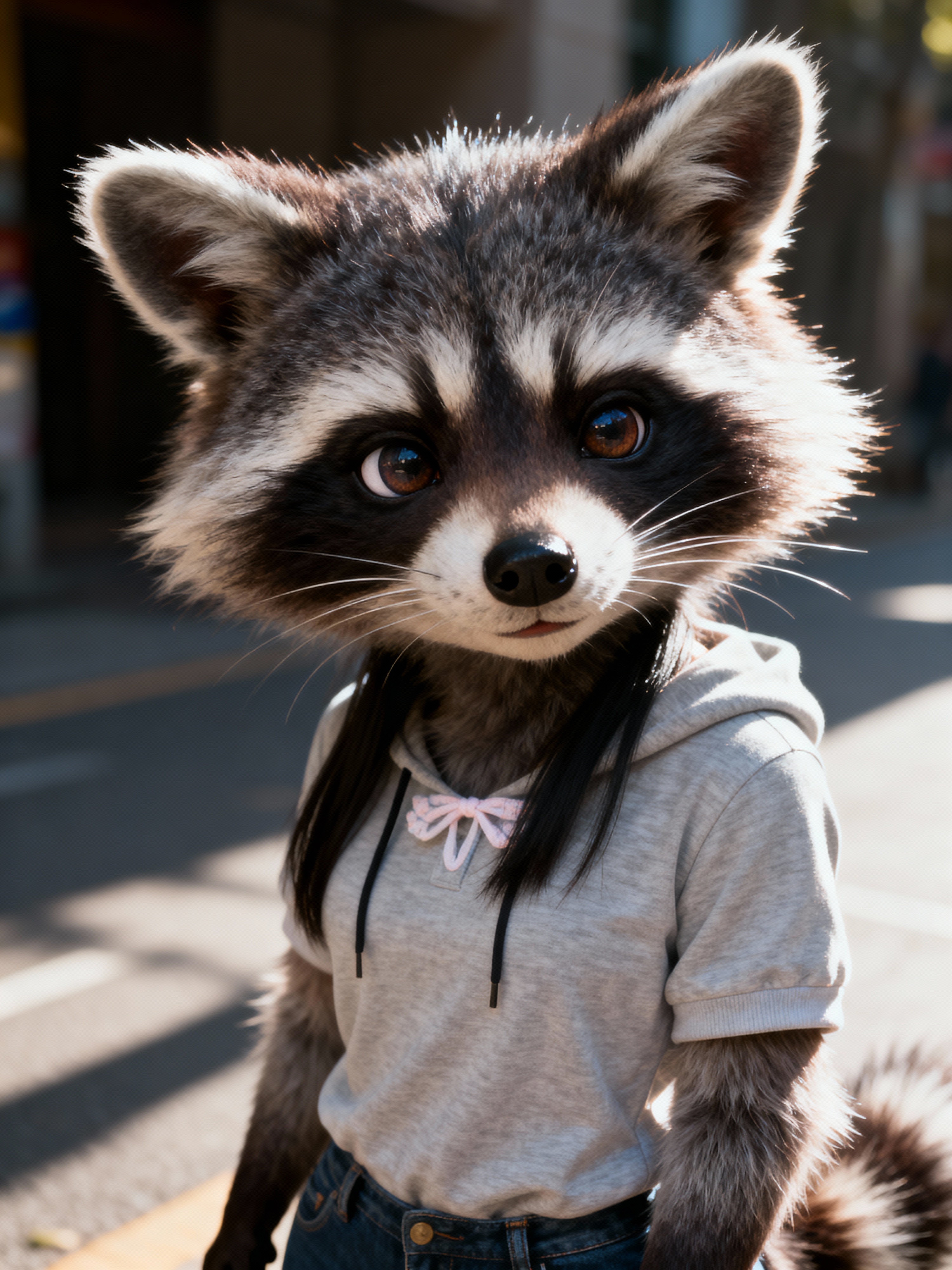furry character of raccoon fursona of model with cute raccoon features, fluffy fur, and cute raccoon ears , wearing cute casual wear, cute expression, detailed digital furry art style