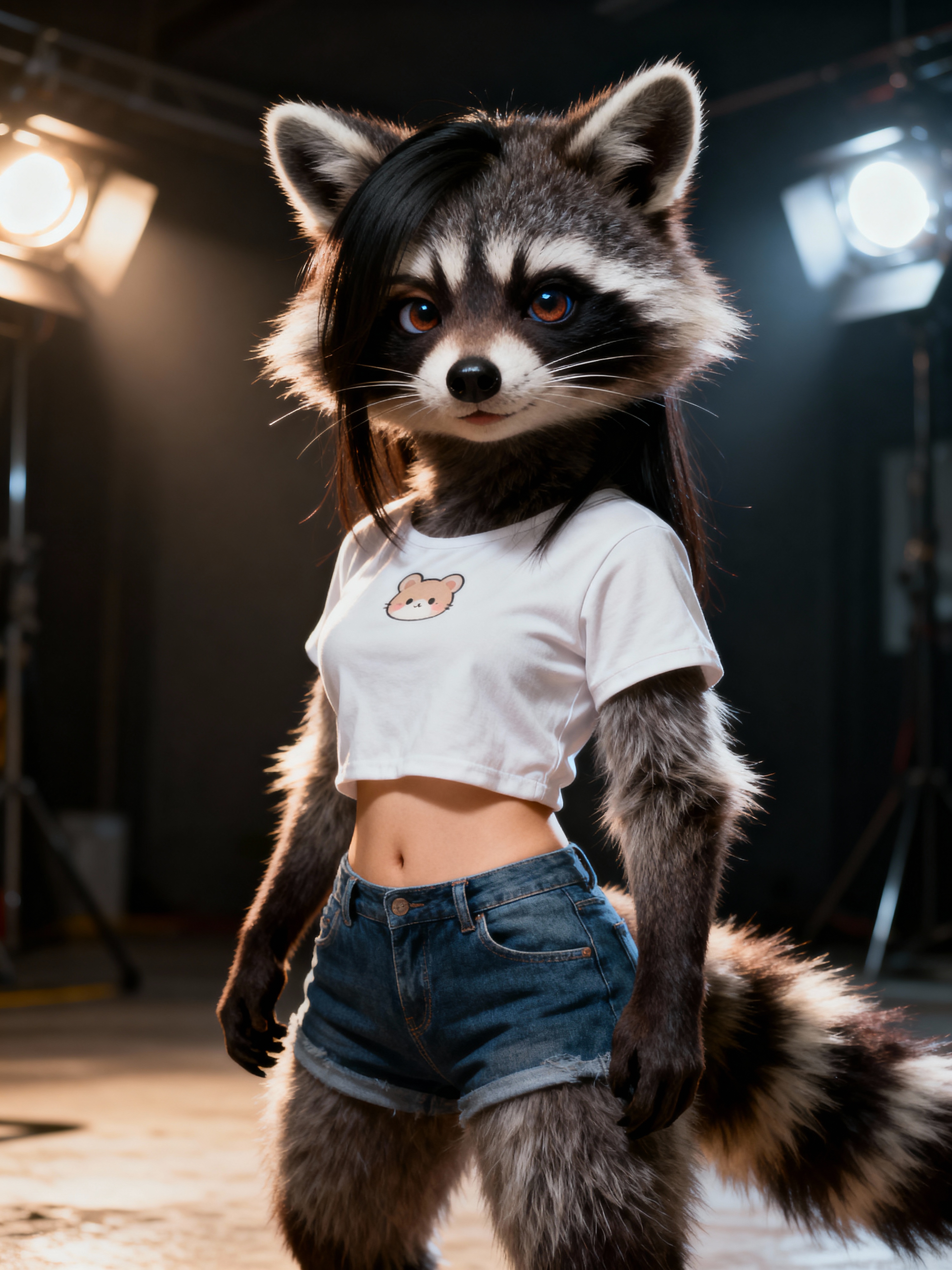 furry character of raccoon fursona of model with cute raccoon features, fluffy fur, and cute raccoon ears , wearing cute casual wear, cute expression, detailed digital furry art style