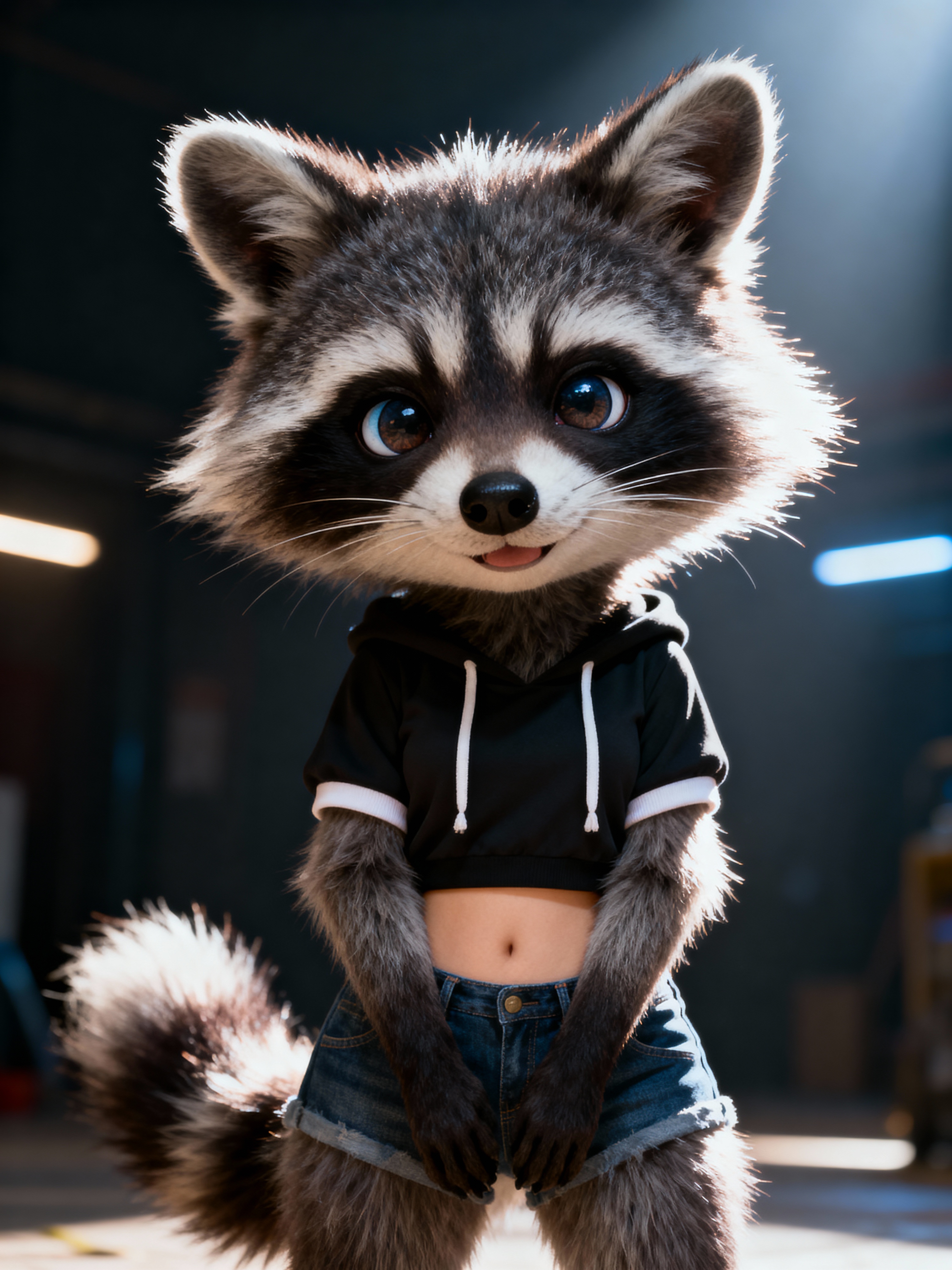 furry character of raccoon fursona of model with cute raccoon features, fluffy fur, and cute raccoon ears , wearing cute casual wear, cute expression, detailed digital furry art style