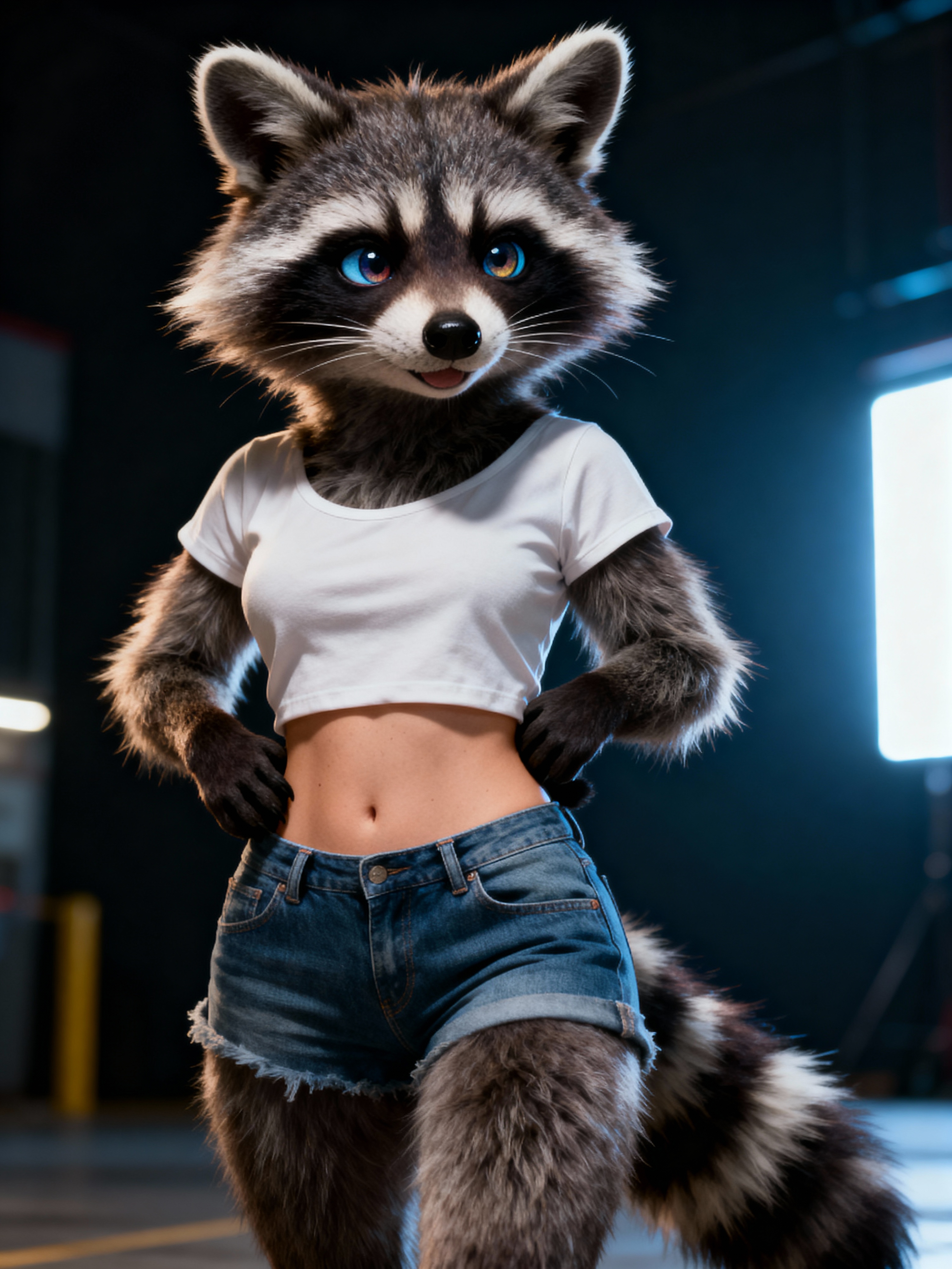 furry character of raccoon fursona of model with cute raccoon features, fluffy fur, and cute raccoon ears , wearing cute casual wear, cute expression, detailed digital furry art style
