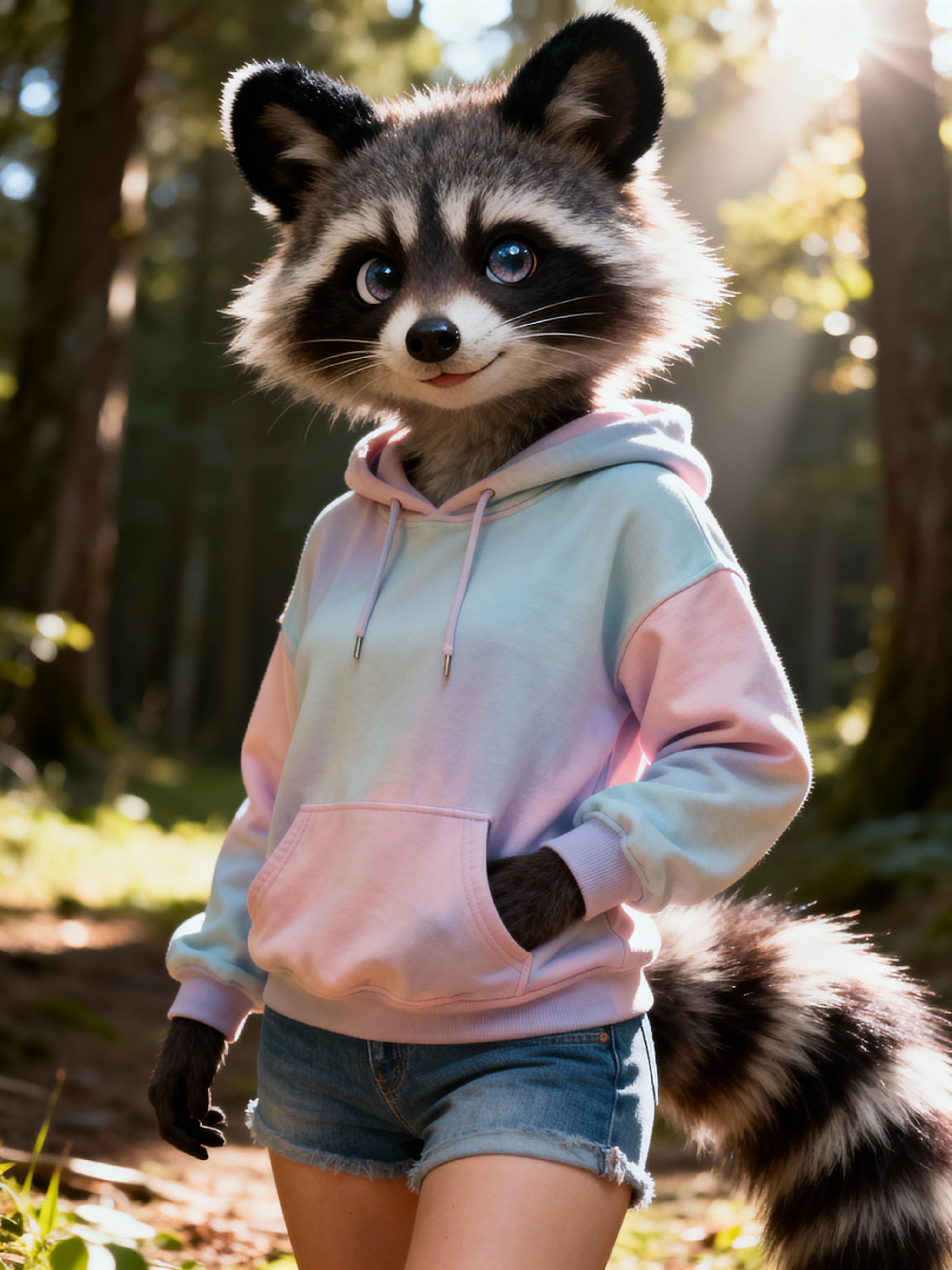 furry character of raccoon fursona of model with cute raccoon features, fluffy fur, and cute raccoon ears , wearing cute casual wear, cute expression, detailed digital furry art style