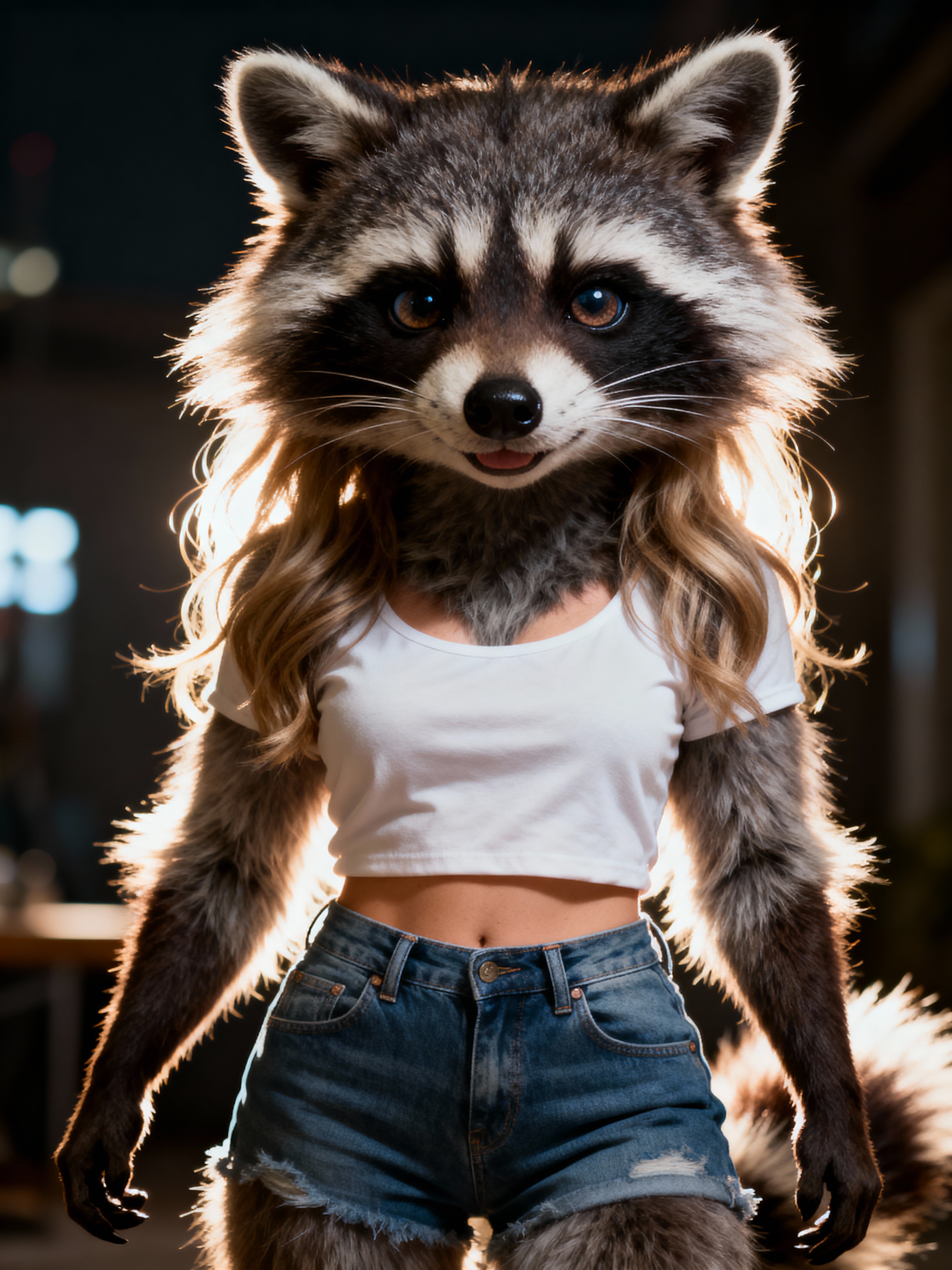 furry character of raccoon fursona of model with cute raccoon features, fluffy fur, and cute raccoon ears , wearing cute casual wear, cute expression, detailed digital furry art style