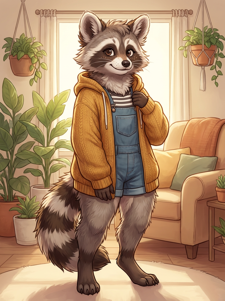 furry character of raccoon fursona of model with cute raccoon features, fluffy fur, and cute raccoon ears , wearing cute casual wear, cute expression, detailed digital furry art style