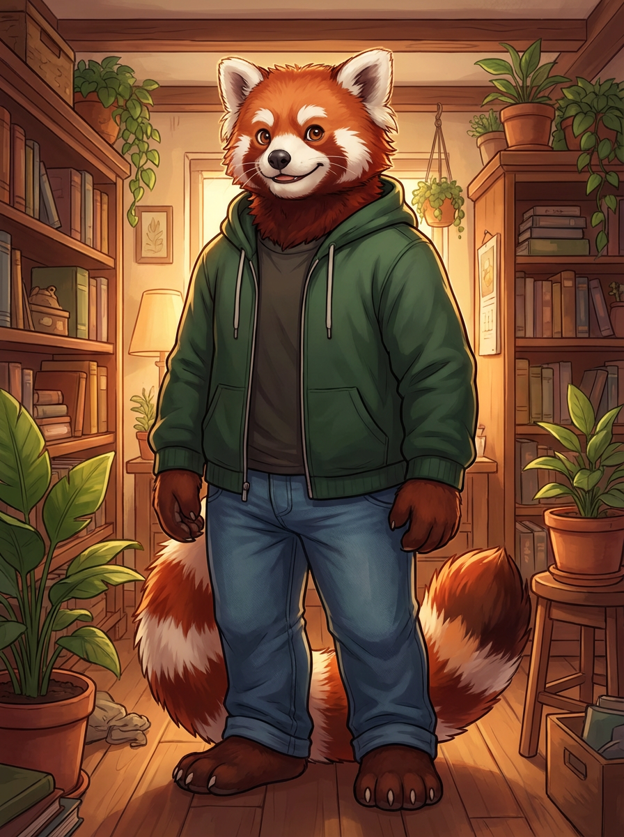 furry character of red panda fursona of model with charming red panda features, fluffy red and white fur, and playful round ears, wearing cute casual wear, cute expression, detailed digital furry art style