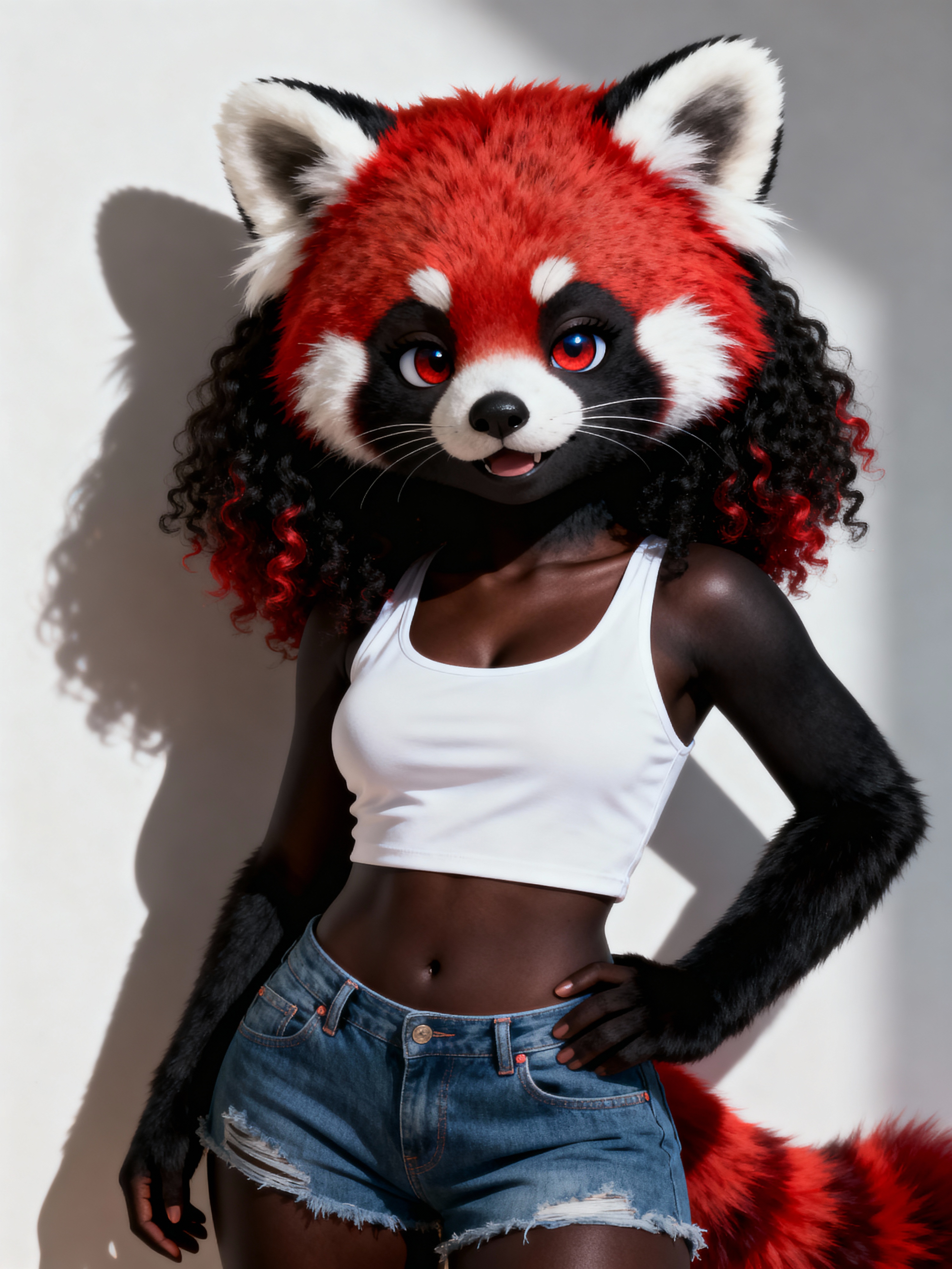 furry character of red panda fursona of model with adorable red panda features, fluffy red and white fur, and cute round ears , wearing cute casual wear, cute expression, detailed digital furry art style