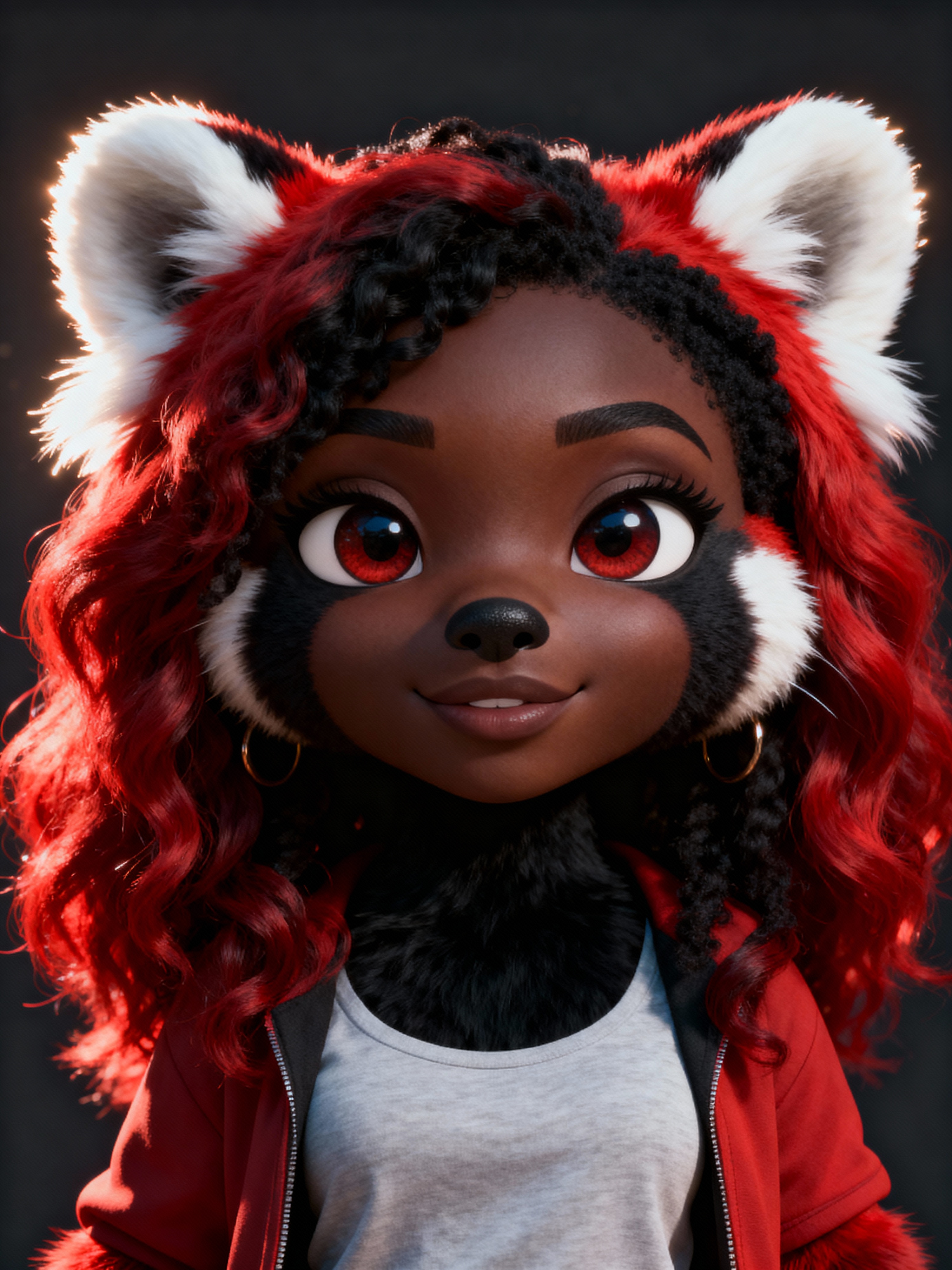 furry character of red panda fursona of model with adorable red panda features, fluffy red and white fur, and cute round ears , wearing cute casual wear, cute expression, detailed digital furry art style