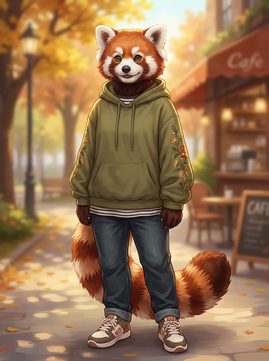 furry character of red panda fursona of model with adorable red panda features, fluffy red and white fur, and cute round ears , wearing cute casual wear, cute expression, detailed digital furry art style