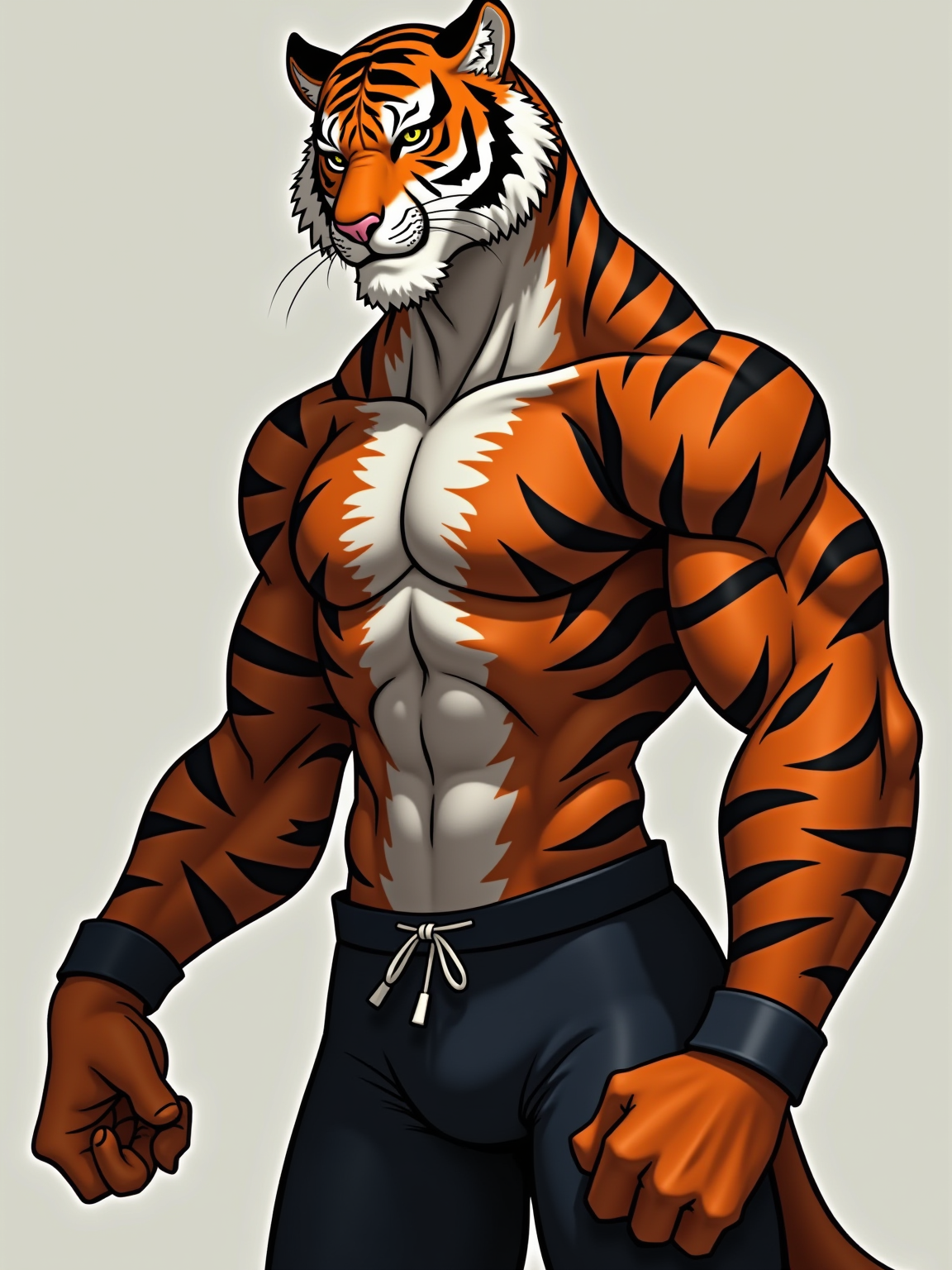 furry character of tiger fursona of model with fierce tiger features, bold orange and black stripes, and prominent ears, wearing athletic wear, determined expression, detailed digital furry art style