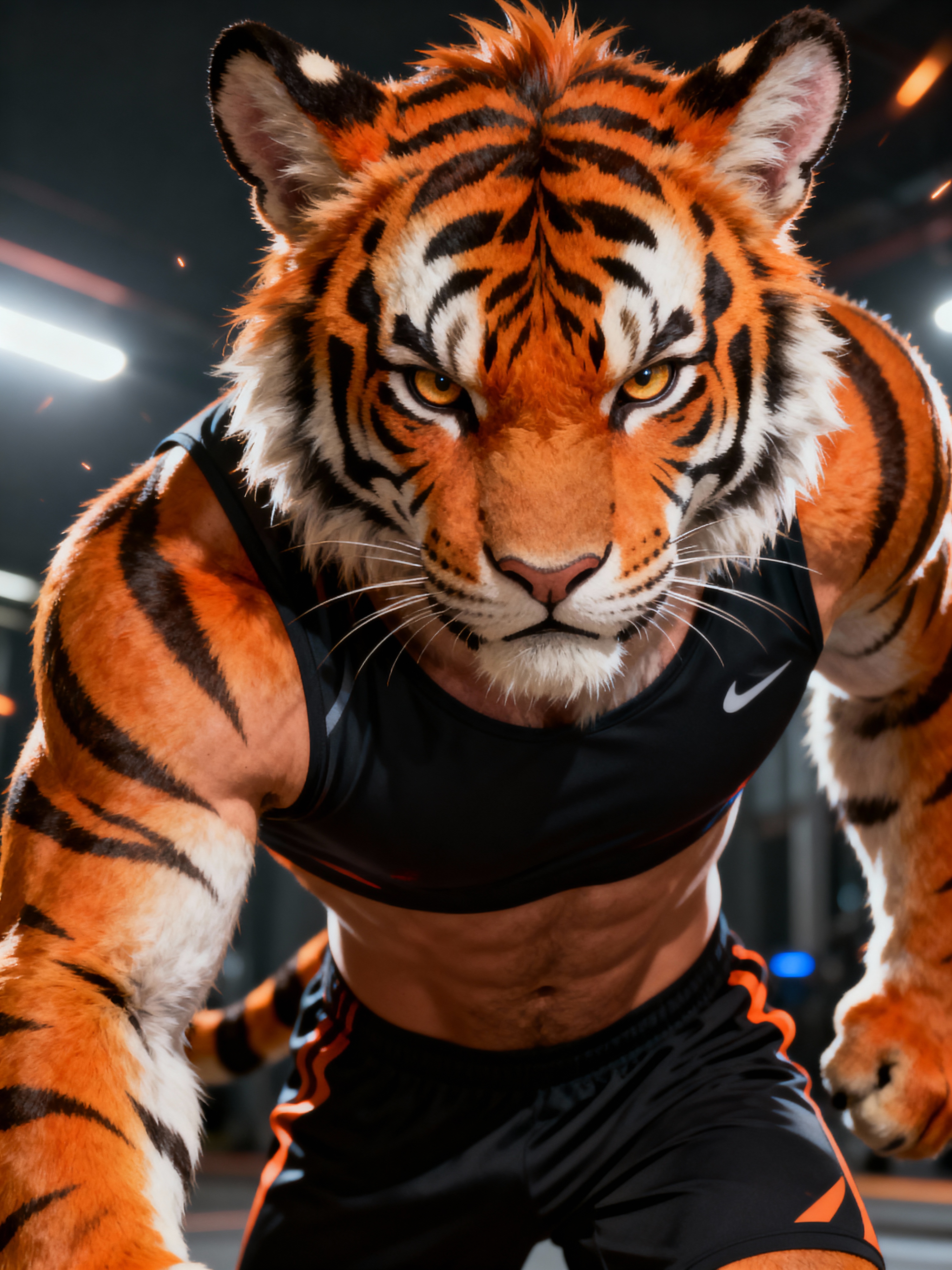 furry character of tiger fursona of model with fierce tiger features, bold orange and black stripes, and prominent ears, wearing athletic wear, determined expression, detailed digital furry art style