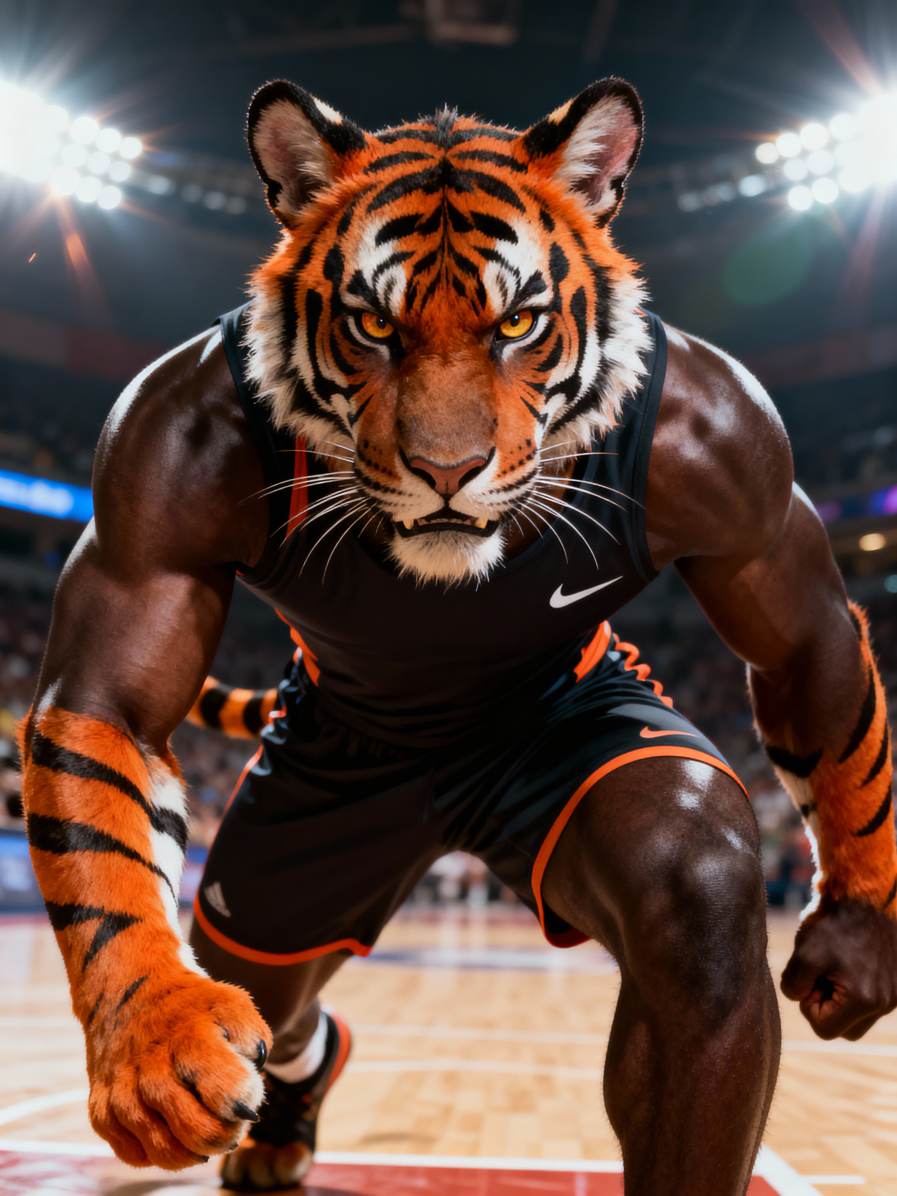 furry character of tiger fursona of model with fierce tiger features, bold orange and black stripes, and prominent ears, wearing athletic wear, determined expression, detailed digital furry art style