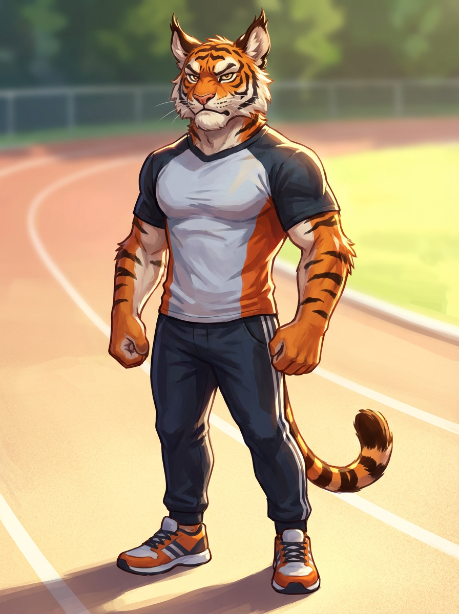 furry character of tiger fursona of model with fierce tiger features, bold orange and black stripes, and prominent ears, wearing athletic wear, determined expression, detailed digital furry art style