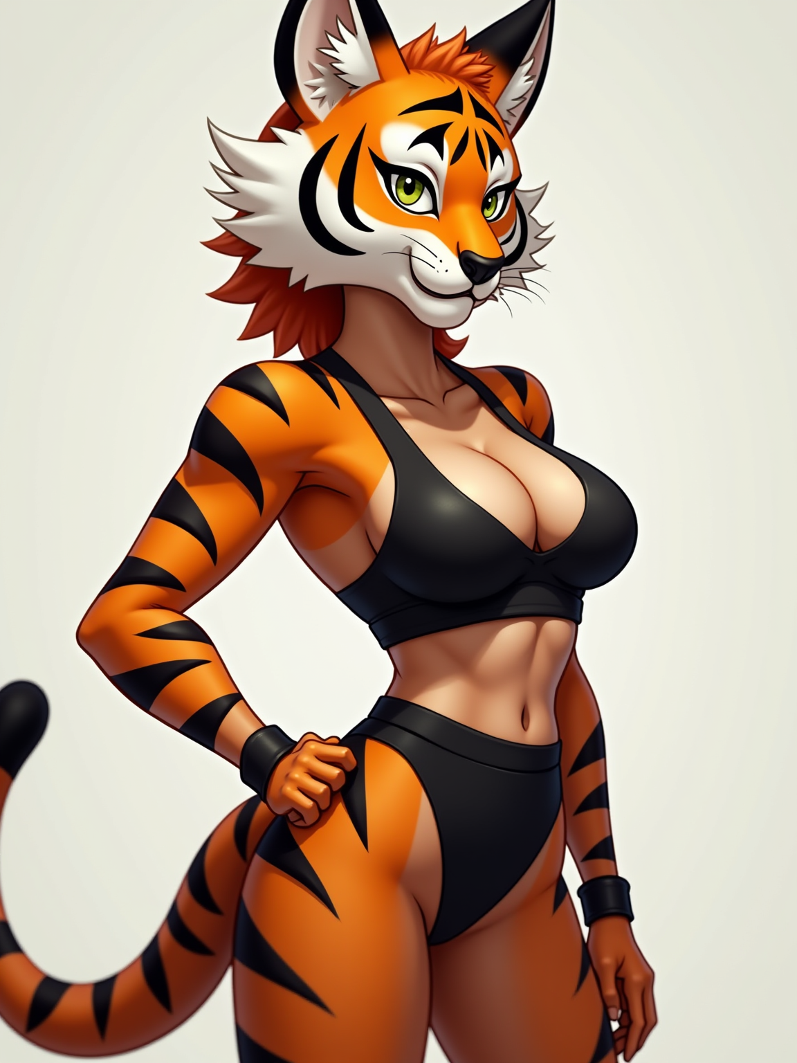 furry character of tiger fursona of model with elegant tiger features, orange and black striped fur, and rounded ears , wearing athletic wear, determined expression, detailed digital furry art style