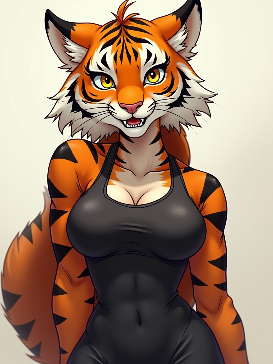 furry character of tiger fursona of model with elegant tiger features, orange and black striped fur, and rounded ears , wearing athletic wear, determined expression, detailed digital furry art style
