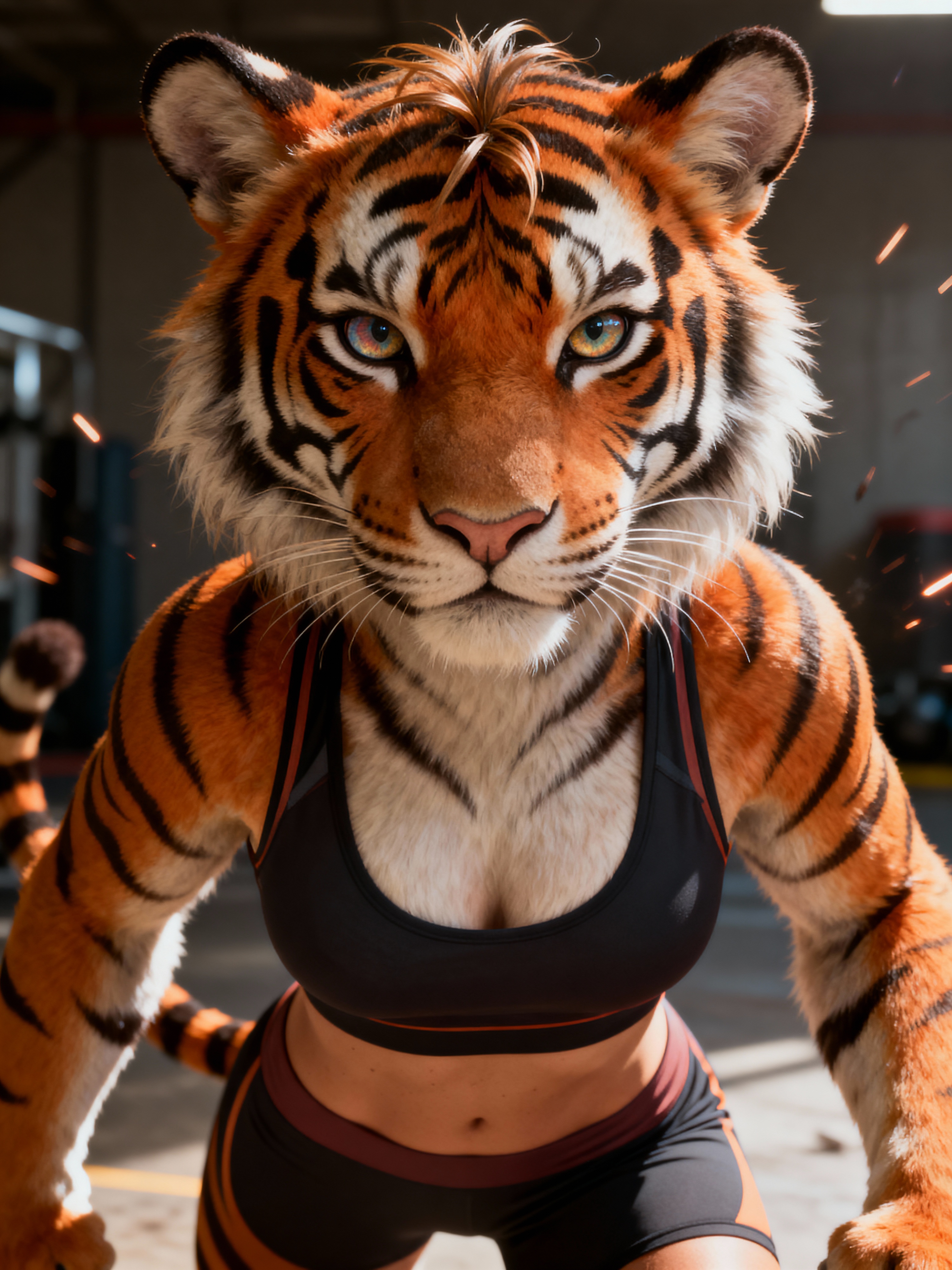 furry character of tiger fursona of model with elegant tiger features, orange and black striped fur, and rounded ears , wearing athletic wear, determined expression, detailed digital furry art style