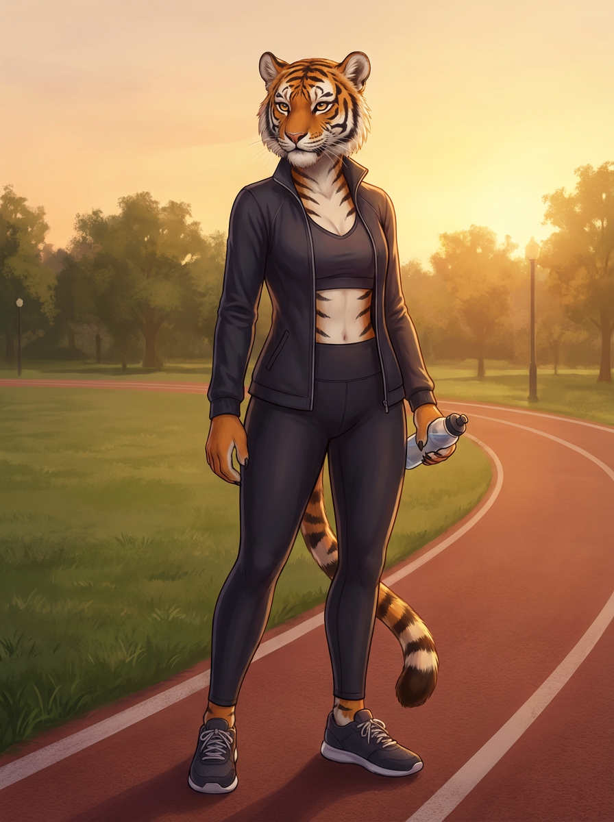 furry character of tiger fursona of model with elegant tiger features, orange and black striped fur, and rounded ears , wearing athletic wear, determined expression, detailed digital furry art style