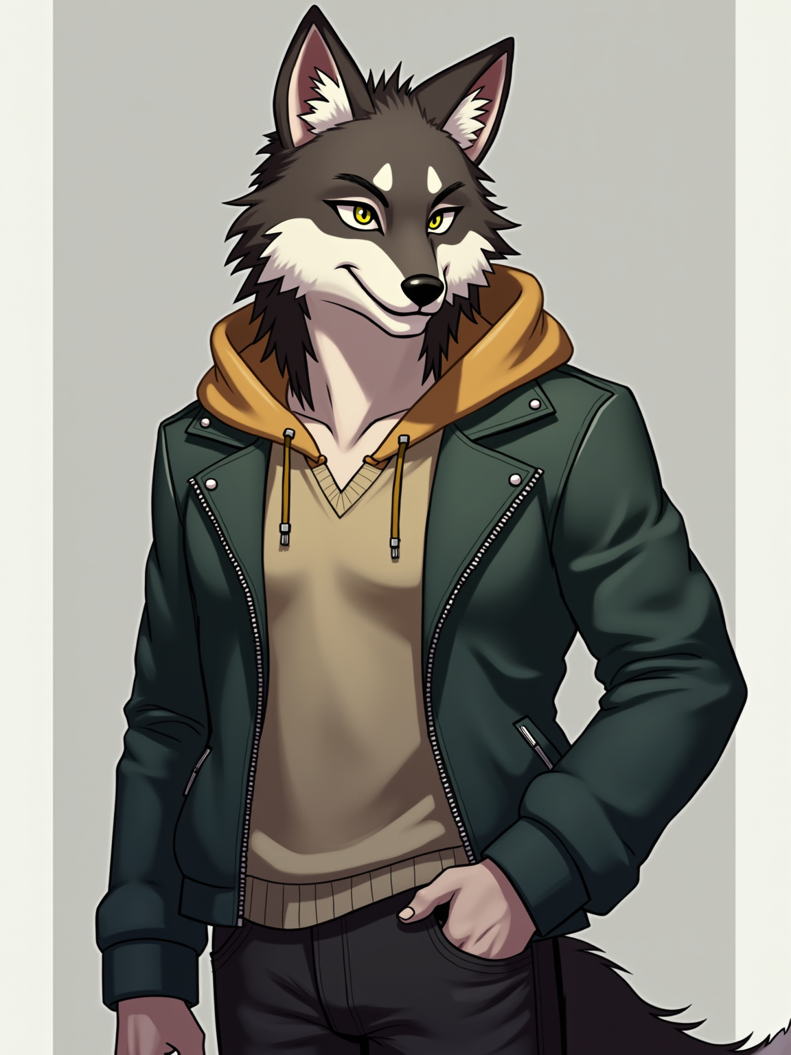 furry character of wolf fursona of model with masculine features, rugged fur, and prominent wolf ears, wearing casual modern clothing, friendly expression, detailed digital furry art style, vibrant colors