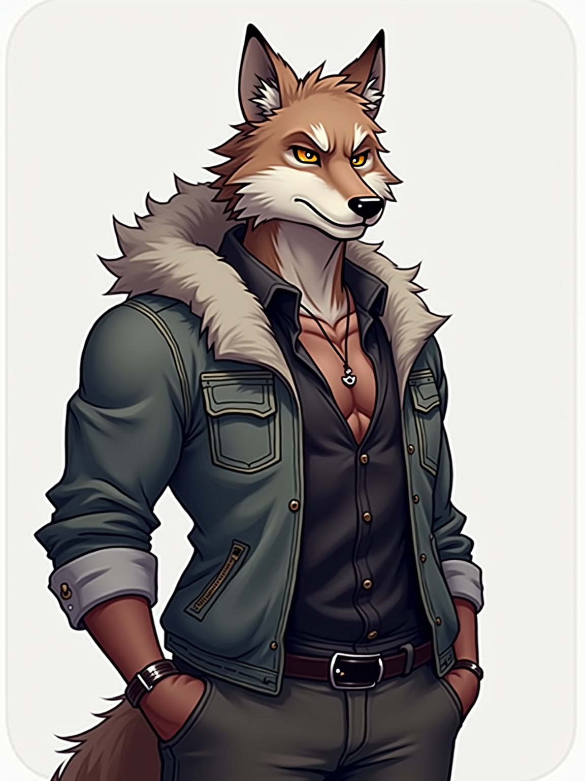 furry character of wolf fursona of model with masculine features, rugged fur, and prominent wolf ears, wearing casual modern clothing, friendly expression, detailed digital furry art style, vibrant colors