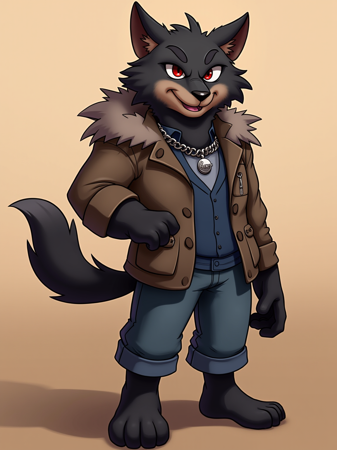 furry character of wolf fursona of model with masculine features, rugged fur, and prominent wolf ears, wearing casual modern clothing, friendly expression, detailed digital furry art style, vibrant colors