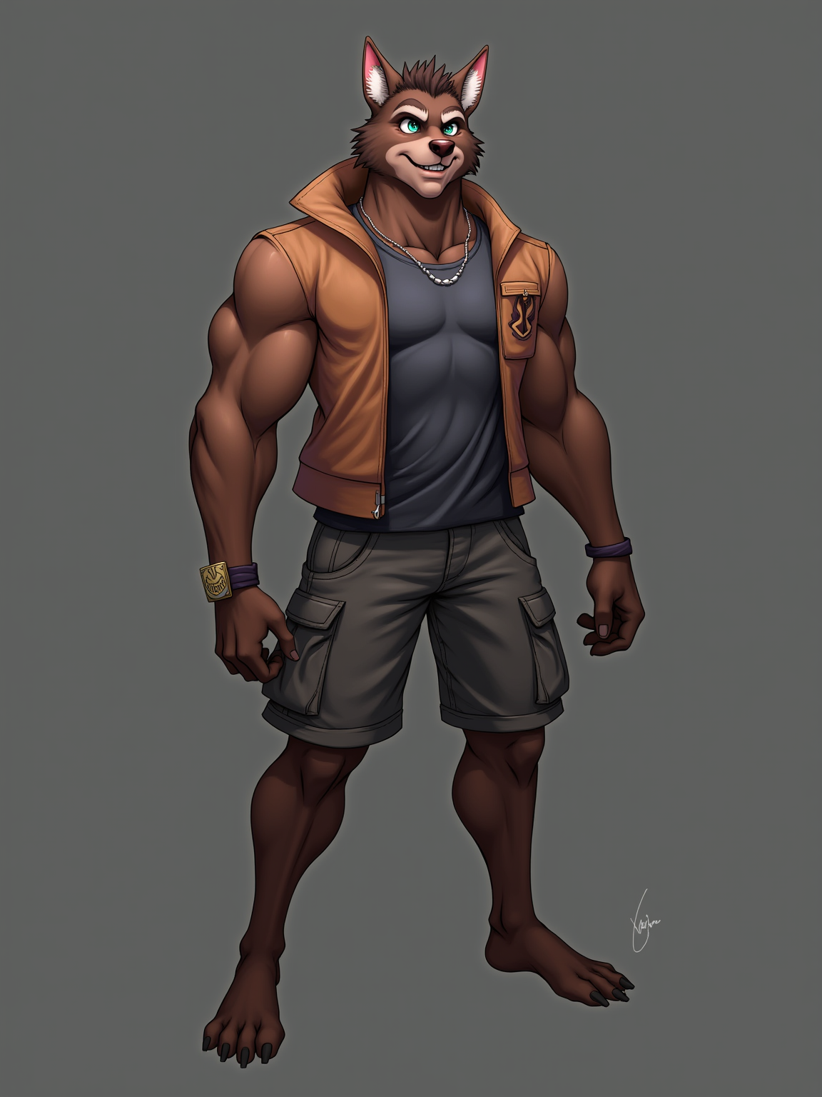 furry character of wolf fursona of model with masculine features, rugged fur, and prominent wolf ears, wearing casual modern clothing, friendly expression, detailed digital furry art style, vibrant colors