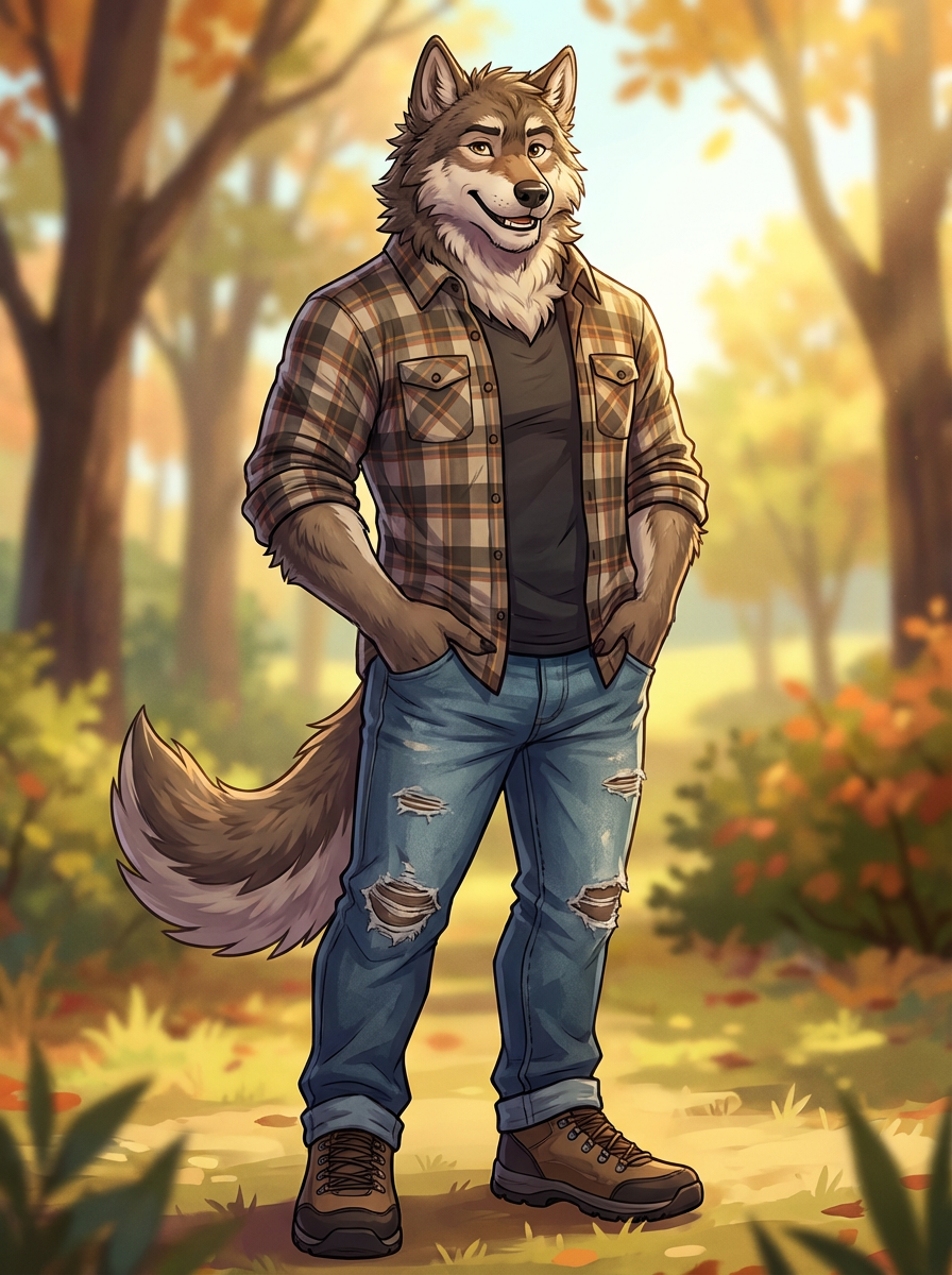 furry character of wolf fursona of model with masculine features, rugged fur, and prominent wolf ears, wearing casual modern clothing, friendly expression, detailed digital furry art style, vibrant colors