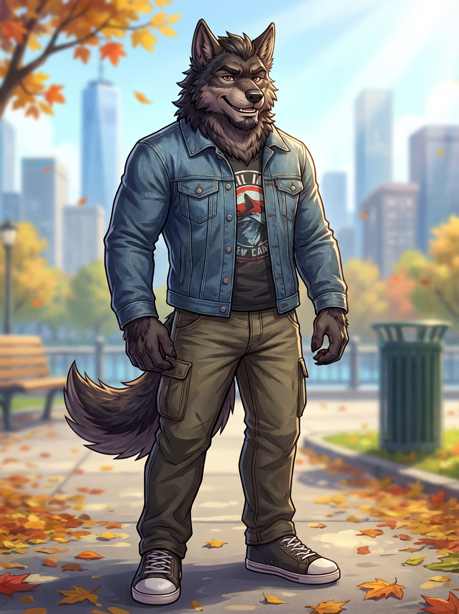 furry character of wolf fursona of model with masculine features, rugged fur, and prominent wolf ears, wearing casual modern clothing, friendly expression, detailed digital furry art style, vibrant colors