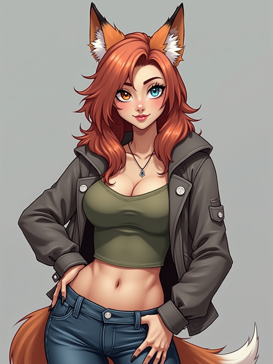 furry character of wolf fursona of model with feminine features, flowing fur, and elegant wolf ears , wearing casual modern clothing, friendly expression, detailed digital furry art style, vibrant colors