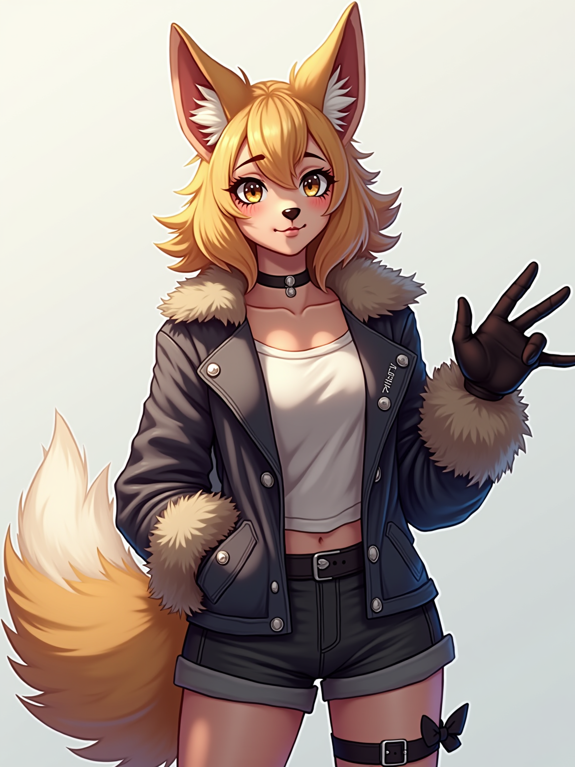 furry character of wolf fursona of model with feminine features, flowing fur, and elegant wolf ears , wearing casual modern clothing, friendly expression, detailed digital furry art style, vibrant colors