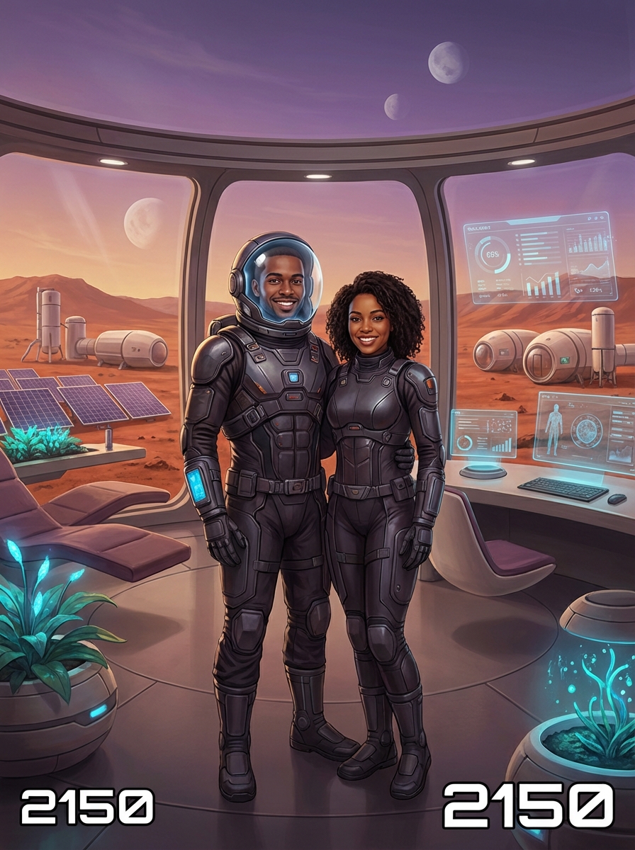 futurist photo of couple in a house on Mars base with year 2150. model as a male space colonist wearing advanced space suit with transparent helmet visor. The Mars base house features curved glass walls, floating furniture, and red Martian landscape visible through panoramic windows. Advanced technology displays, holographic interfaces, and bioluminescent plants create ambient lighting. The couple stands together looking out at the rust-colored Martian terrain with two moons visible in the purple-orange sky. Futuristic architecture with sustainable living pods, solar collectors, and atmospheric processors in the background, text overlay in bottom corner reading "2150" in white sans serif font with black outline