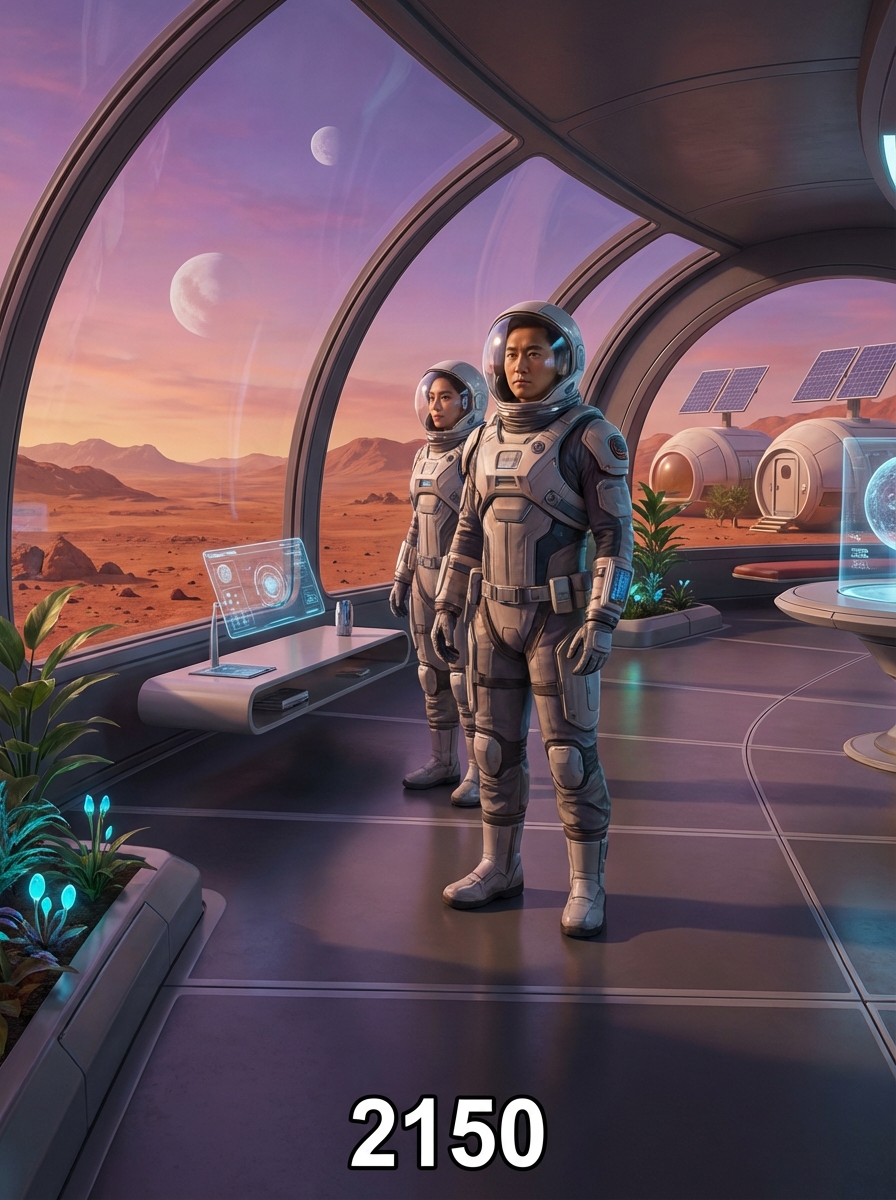 futurist photo of couple in a house on Mars base with year 2150. model as a male space colonist wearing advanced space suit with transparent helmet visor. The Mars base house features curved glass walls, floating furniture, and red Martian landscape visible through panoramic windows. Advanced technology displays, holographic interfaces, and bioluminescent plants create ambient lighting. The couple stands together looking out at the rust-colored Martian terrain with two moons visible in the purple-orange sky. Futuristic architecture with sustainable living pods, solar collectors, and atmospheric processors in the background, text overlay in bottom corner reading "2150" in white sans serif font with black outline