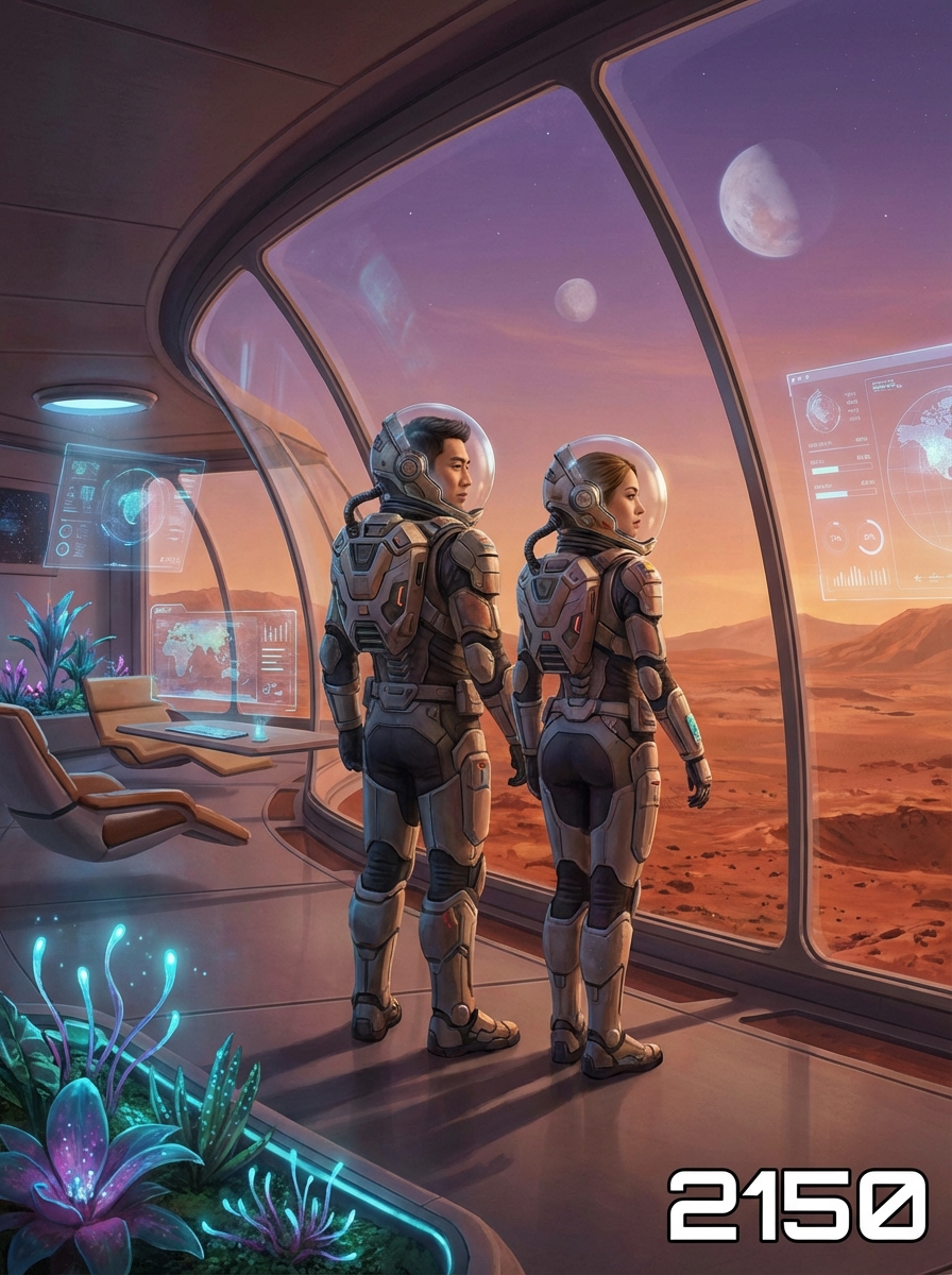 futurist photo of couple in a house on Mars base with year 2150. model as a male space colonist wearing advanced space suit with transparent helmet visor. The Mars base house features curved glass walls, floating furniture, and red Martian landscape visible through panoramic windows. Advanced technology displays, holographic interfaces, and bioluminescent plants create ambient lighting. The couple stands together looking out at the rust-colored Martian terrain with two moons visible in the purple-orange sky. Futuristic architecture with sustainable living pods, solar collectors, and atmospheric processors in the background, text overlay in bottom corner reading "2150" in white sans serif font with black outline