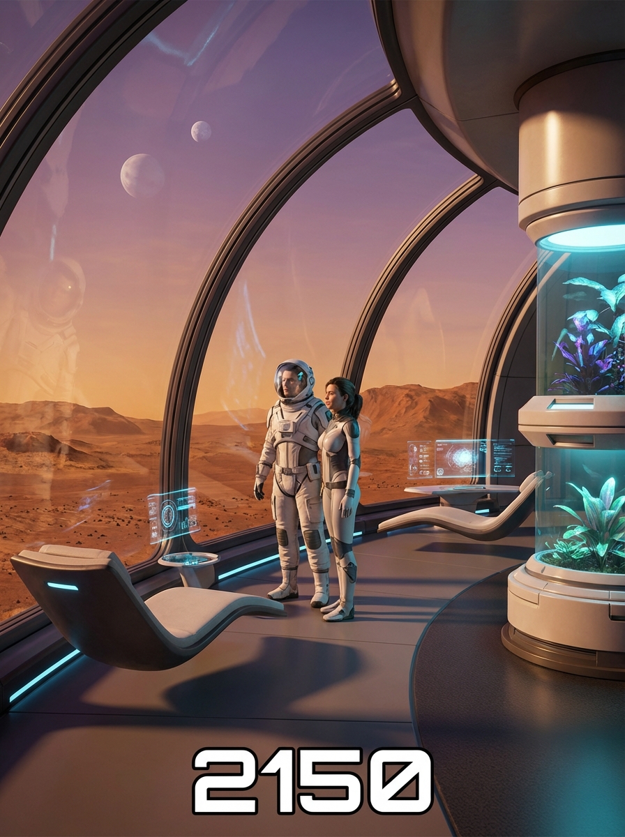 futurist photo of couple in a house on Mars base with year 2150. model as a male space colonist wearing advanced space suit with transparent helmet visor. The Mars base house features curved glass walls, floating furniture, and red Martian landscape visible through panoramic windows. Advanced technology displays, holographic interfaces, and bioluminescent plants create ambient lighting. The couple stands together looking out at the rust-colored Martian terrain with two moons visible in the purple-orange sky. Futuristic architecture with sustainable living pods, solar collectors, and atmospheric processors in the background, text overlay in bottom corner reading "2150" in white sans serif font with black outline