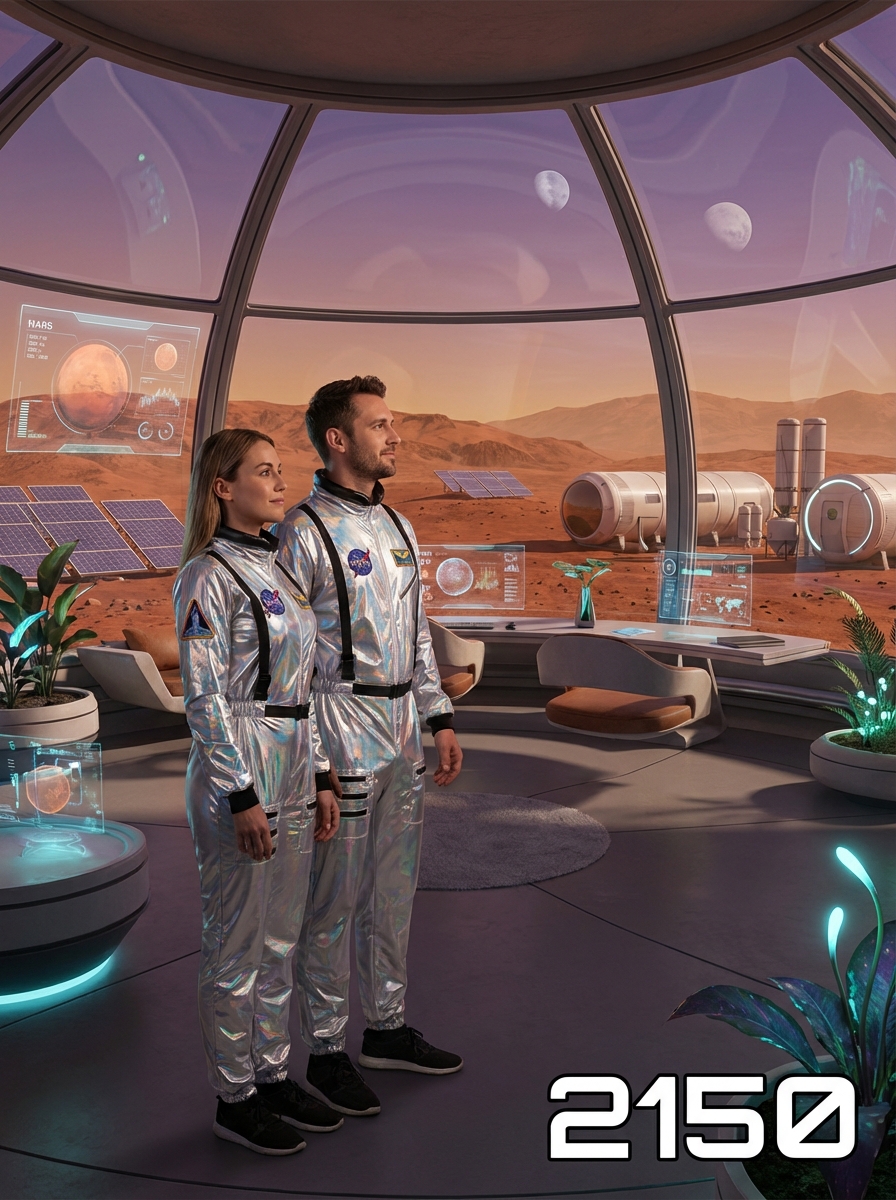futurist photo of couple in a house on Mars base with year 2150. model as a female space colonist wearing sleek metallic silver jumpsuit with holographic accents . The Mars base house features curved glass walls, floating furniture, and red Martian landscape visible through panoramic windows. Advanced technology displays, holographic interfaces, and bioluminescent plants create ambient lighting. The couple stands together looking out at the rust-colored Martian terrain with two moons visible in the purple-orange sky. Futuristic architecture with sustainable living pods, solar collectors, and atmospheric processors in the background, text overlay in bottom corner reading "2150" in white sans serif font with black outline