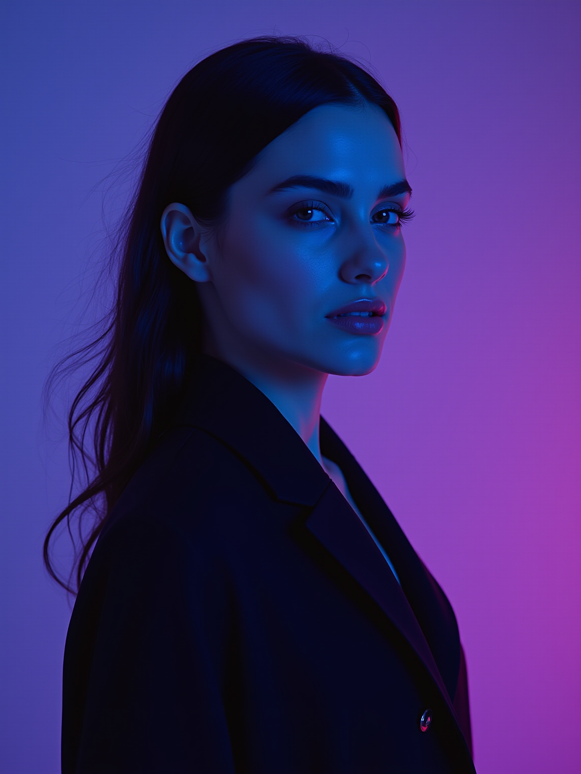 Futuristic fashion portrait of a model, dramatic side lighting in blue and purple hues. Model wearing black outfit. The mood is cyberpunk-inspired, high contrast, with glowing highlights on the skin and surreal atmosphere. Studio backdrop fades from violet to lavender. Sharp, editorial, high-fashion aesthetic