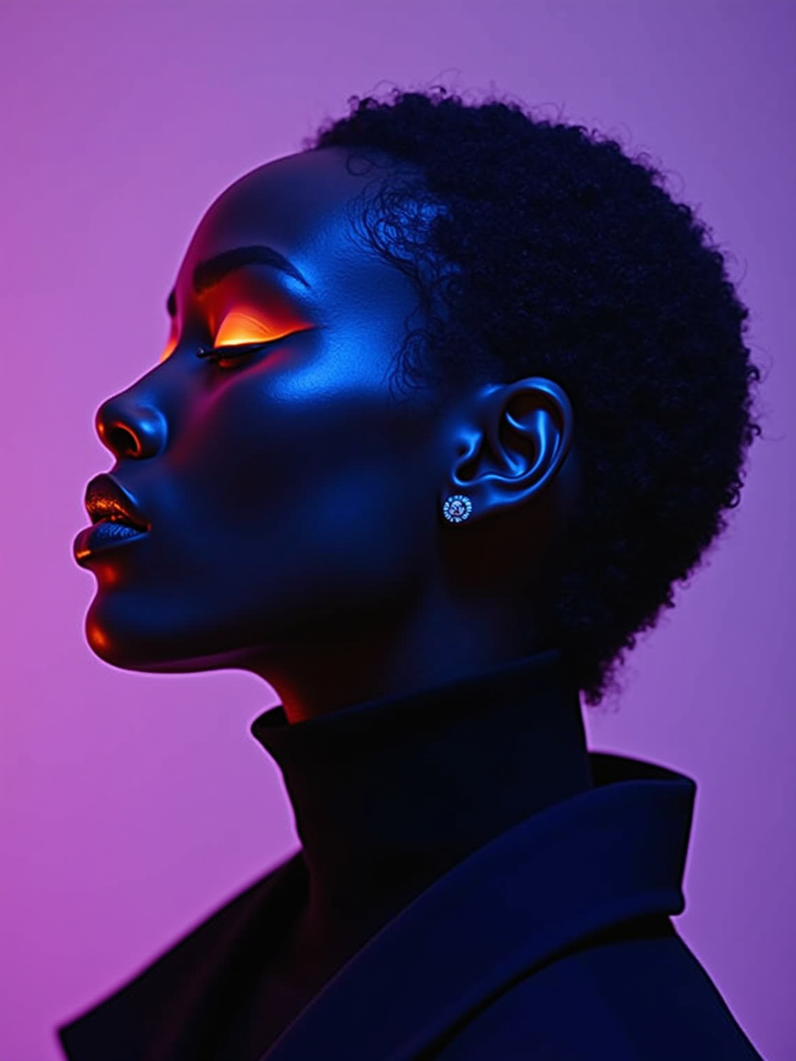 Futuristic fashion portrait of a model, dramatic side lighting in blue and purple hues. Model wearing black outfit. The mood is cyberpunk-inspired, high contrast, with glowing highlights on the skin and surreal atmosphere. Studio backdrop fades from violet to lavender. Sharp, editorial, high-fashion aesthetic