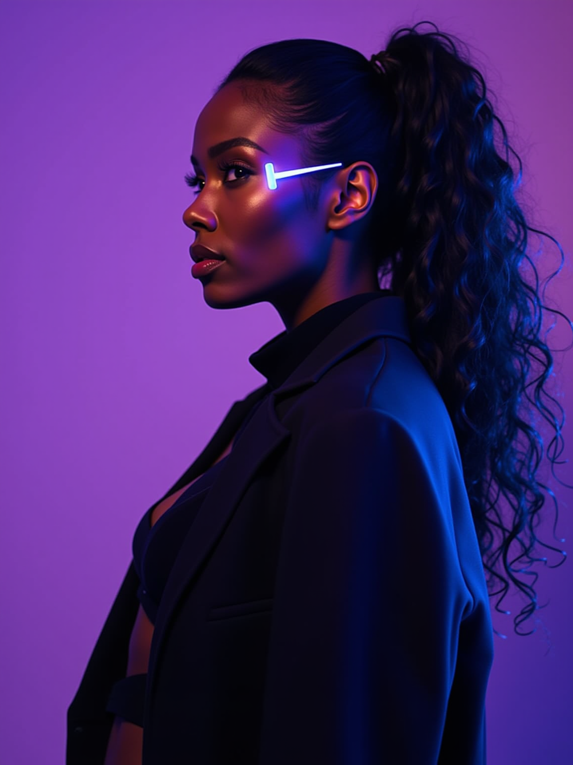 Futuristic fashion portrait of a model, dramatic side lighting in blue and purple hues. Model wearing black outfit. The mood is cyberpunk-inspired, high contrast, with glowing highlights on the skin and surreal atmosphere. Studio backdrop fades from violet to lavender. Sharp, editorial, high-fashion aesthetic