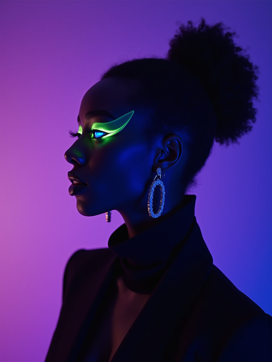 Futuristic fashion portrait of a model, dramatic side lighting in blue and purple hues. Model wearing black outfit. The mood is cyberpunk-inspired, high contrast, with glowing highlights on the skin and surreal atmosphere. Studio backdrop fades from violet to lavender. Sharp, editorial, high-fashion aesthetic