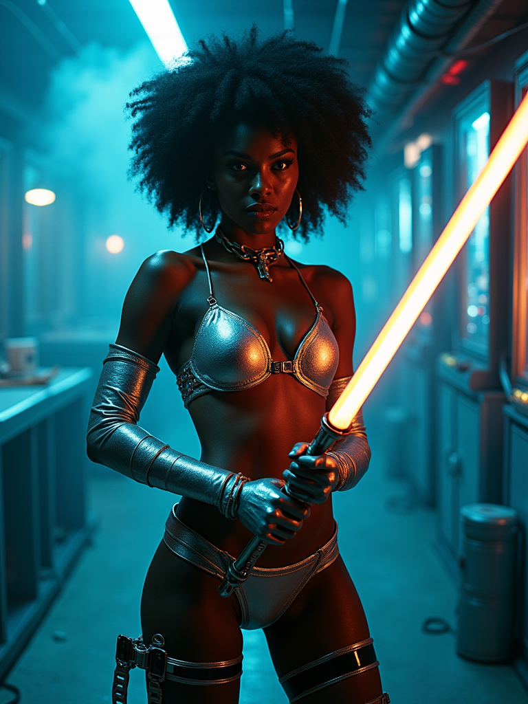 Galactic fantasy scene of model in metallic glossy silver and black space-themed lingerie, holding a glowing glowing sci-fi energy sword. She poses in a smoky, dimly lit room filled with sci-fi props and glowing tech elements. Her confident warrior stance and sharp expression give her an interstellar dominatrix vibe.