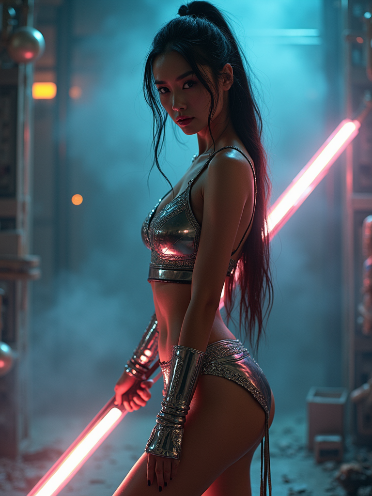 Galactic fantasy scene of model in metallic glossy silver and black space-themed lingerie, holding a glowing glowing sci-fi energy sword. She poses in a smoky, dimly lit room filled with sci-fi props and glowing tech elements. Her confident warrior stance and sharp expression give her an interstellar dominatrix vibe.